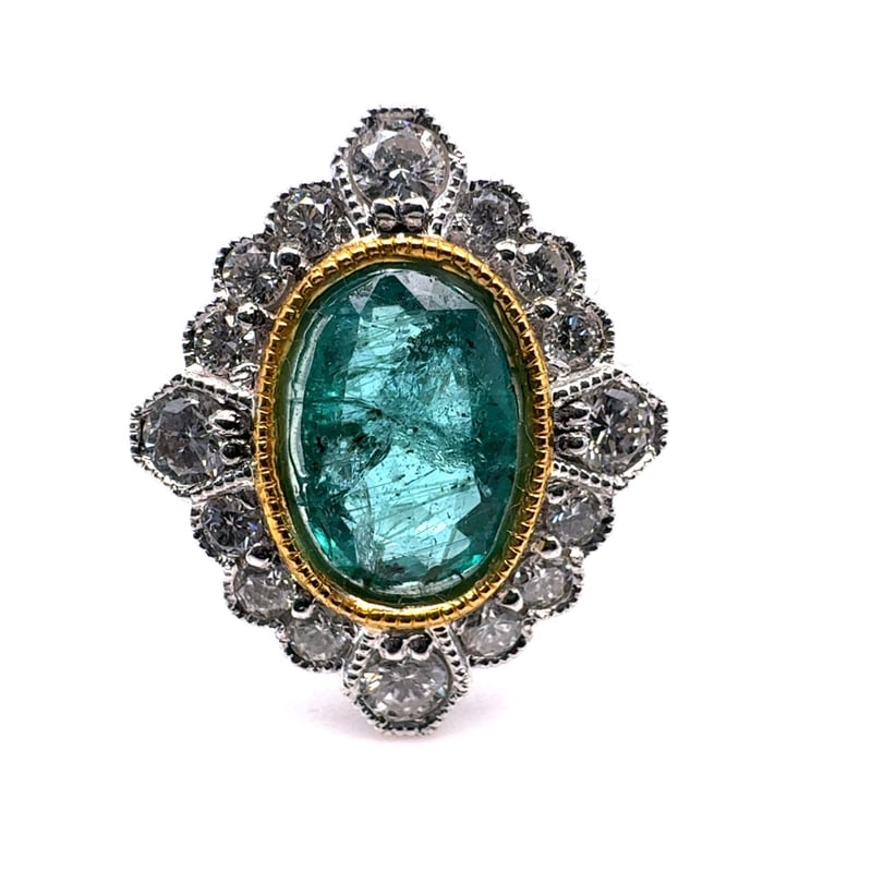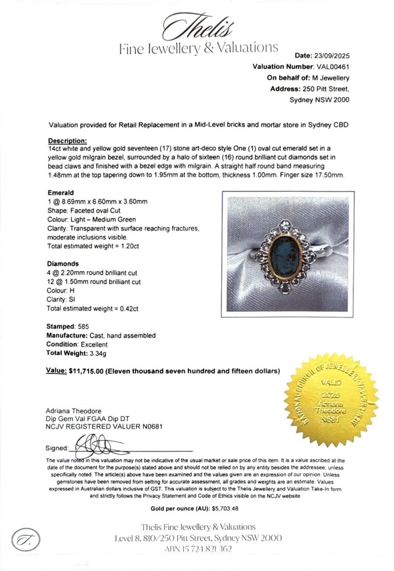 14CT WHITE AND YELLOW GOLD EMERALD AND DIAMOND RINGE = 1.20CtD = 0.42CtVal #00461Condition: Good - Refer To ImagesThis valuation has been conducted by an independent third-party professional. The valuation amount is an assessment by the issuing valuer and does not reflect the auction value of the item.Any inquiries regarding the valuation should be directed to the issuing valuer (refer to contact details on the certificate), as Lloyds Auctions has no affiliation or influence over the valuation, the valuer, or the stated amount.Insurance Replacement Valuation Amount: $11,715.00488487+9