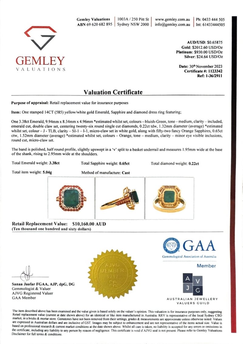 14CT YELLOW/WHITE GOLD EMERALD CUT EMERALD, SAPPHIRE AND DIAMOND RINGE = 3.38CtS = 0.65CtD = 0.22CtVal #1123342Condition: Good - Refer To ImagesThis valuation has been conducted by an independent third-party professional. The valuation amount is an assessment by the issuing valuer and does not reflect the auction value of the item.Any inquiries regarding the valuation should be directed to the issuing valuer (refer to contact details on the certificate), as Lloyds Auctions has no affiliation or influence over the valuation, the valuer, or the stated amount.Insurance Replacement Valuation Amount: $10,160.00488487+61
