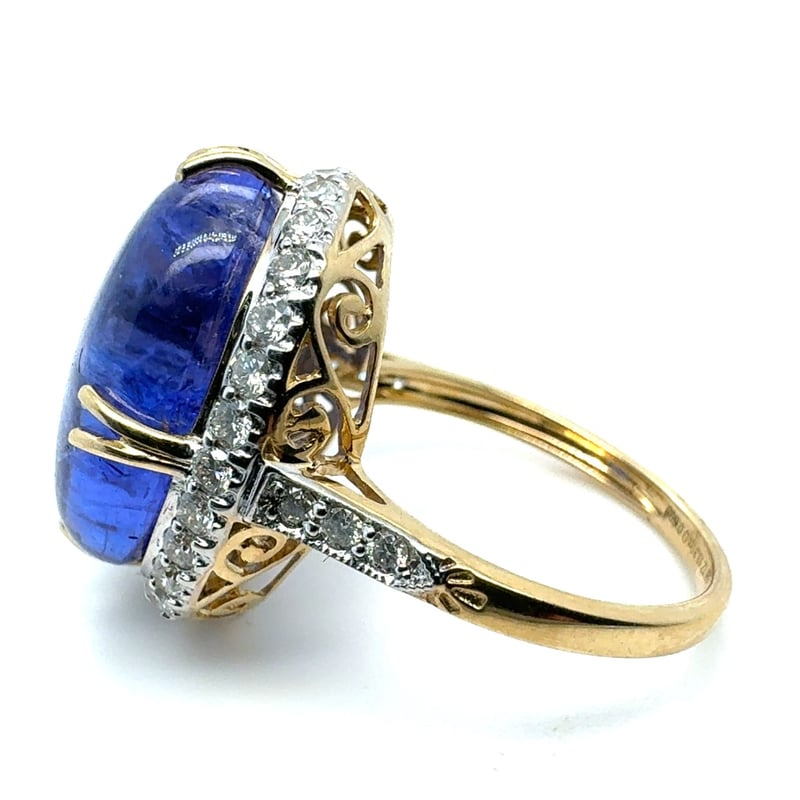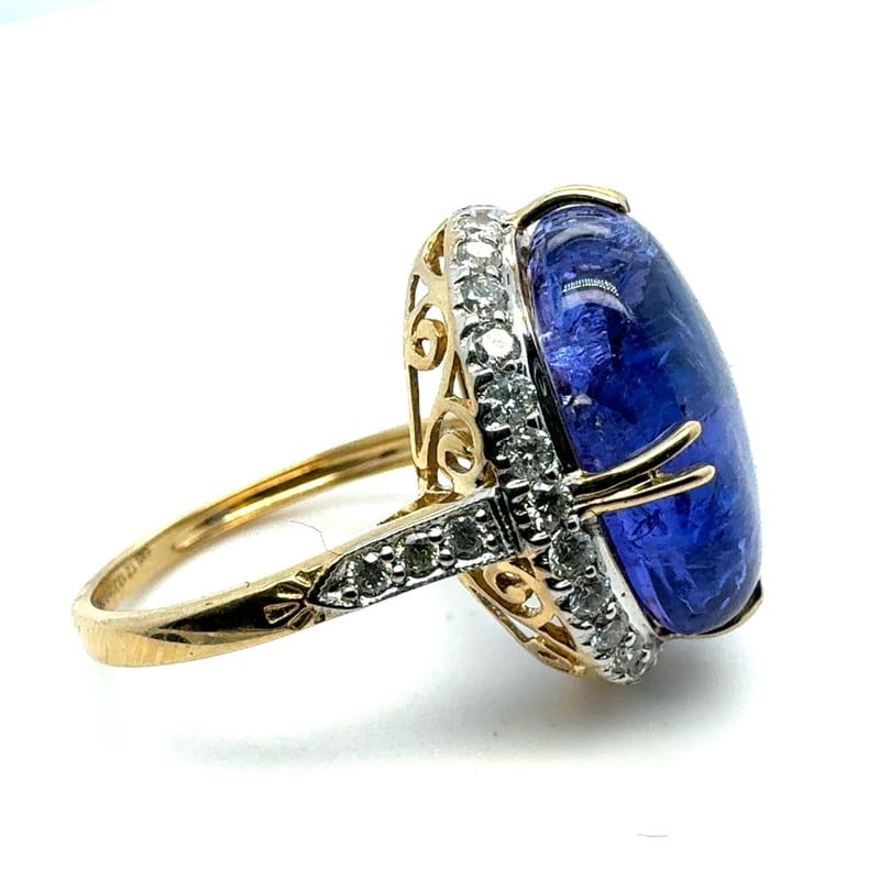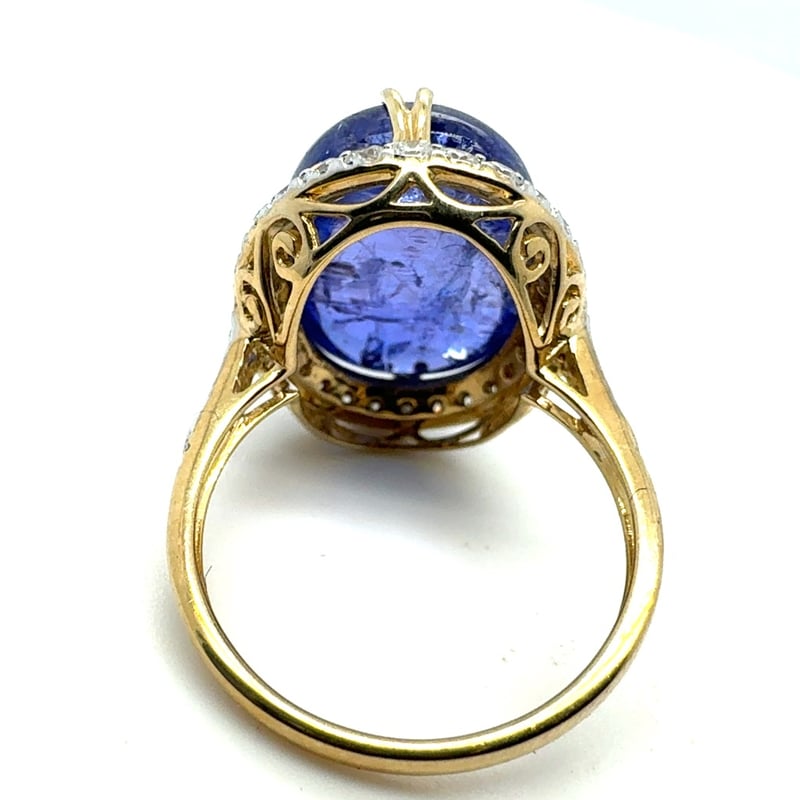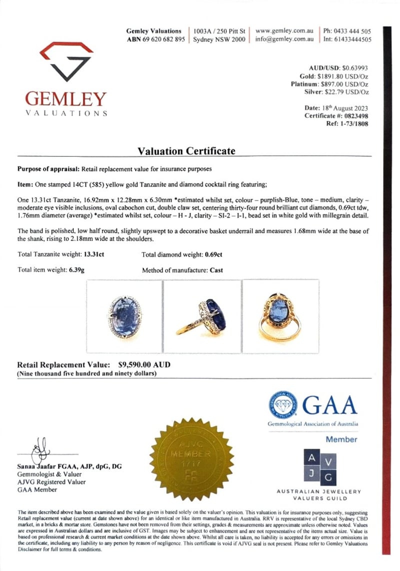 14CT YELLOW GOLD OVAL CABOCHON SHAPE TANZANITE AND DIAMOND RINGT = 13.31CtD = 0.69CtVal #0823498Condition: Good - Refer To ImagesThis valuation has been conducted by an independent third-party professional. The valuation amount is an assessment by the issuing valuer and does not reflect the auction value of the item.Any inquiries regarding the valuation should be directed to the issuing valuer (refer to contact details on the certificate), as Lloyds Auctions has no affiliation or influence over the valuation, the valuer, or the stated amount.Insurance Replacement Valuation Amount: $9,590.00488487+109