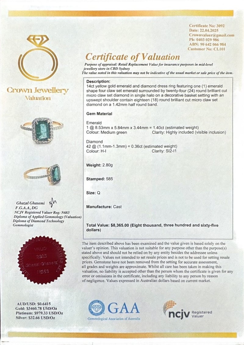 14CT YELLOW GOLD EMERALD CUT EMERALD AND DIAMOND RINGE = 1.40Ct D = 0.36CtVal #3092Condition: Good - Refer To ImagesThis valuation has been conducted by an independent third-party professional. The valuation amount is an assessment by the issuing valuer and does not reflect the auction value of the item.Any inquiries regarding the valuation should be directed to the issuing valuer (refer to contact details on the certificate), as Lloyds Auctions has no affiliation or influence over the valuation, the valuer, or the stated amount.Insurance Replacement Valuation Amount: $8,365.00488487+93