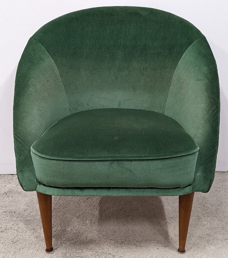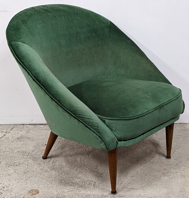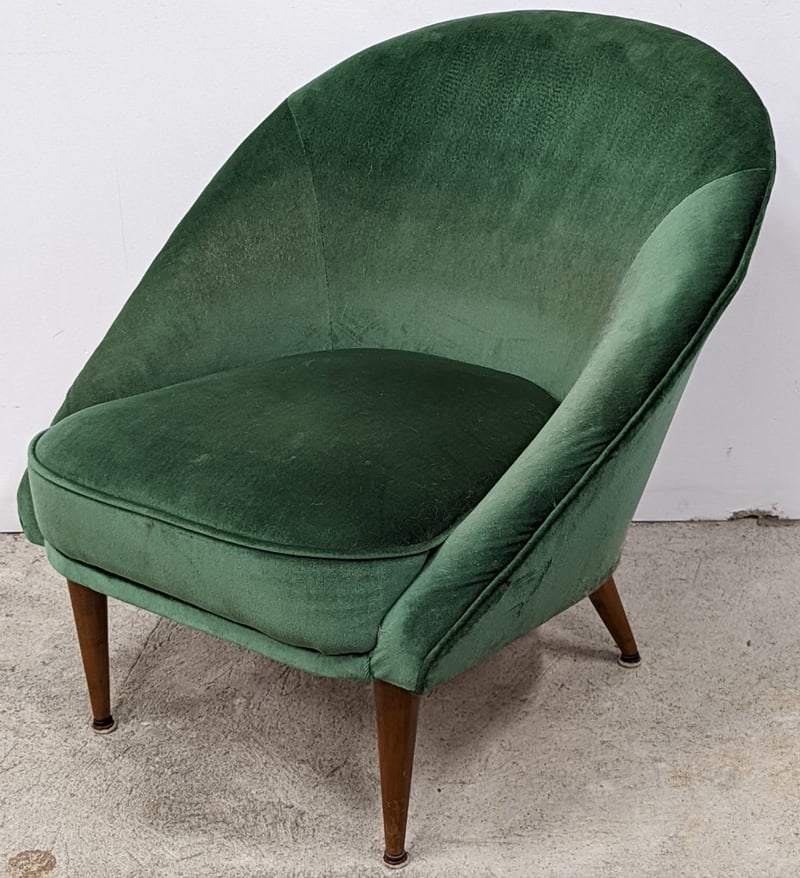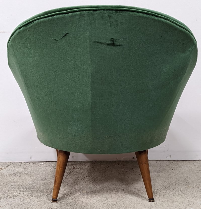 RETRO STYLE SUN ROOM / PARLOR CHAIR Item Size: Height: 75cm, Width: 75cm, Depth: 80cm, Weight: 13.5Kg Featuring A Timber Frame With Detachable Legs And Moss Green Upholstery. The Padding Is Comfortable And The Chair Is In Very Good Condition, Commensurate With Age