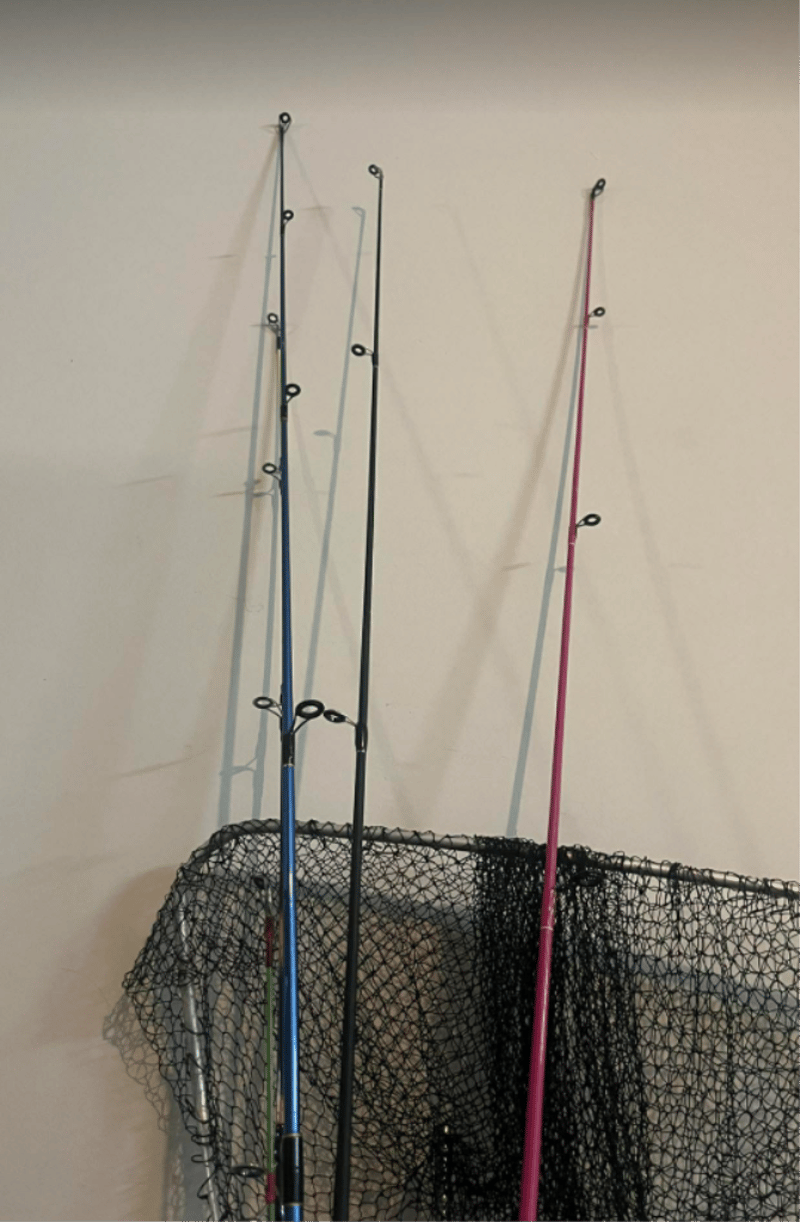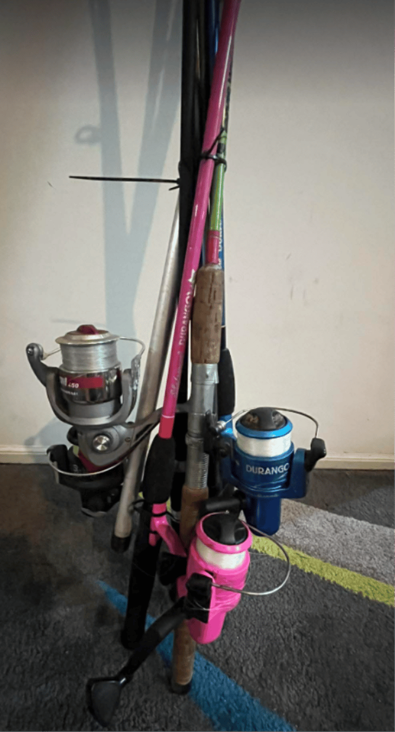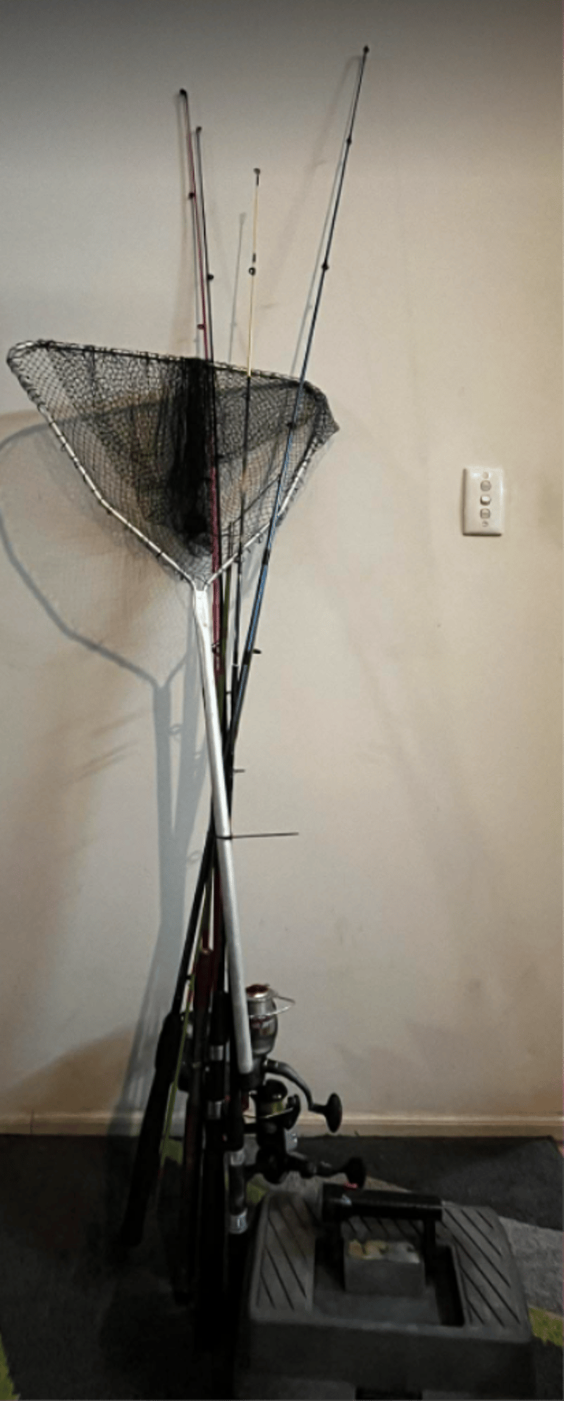 Mixed Fishing Rods, Tackle box (equipped), Fishing Net. (4 Reels & 5 Fishing rods in total). Refer to images.
