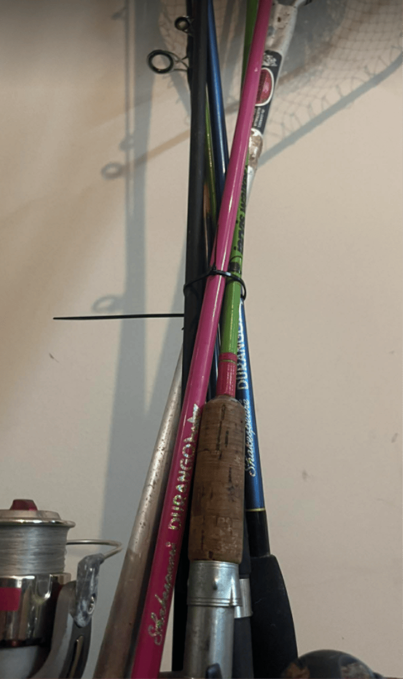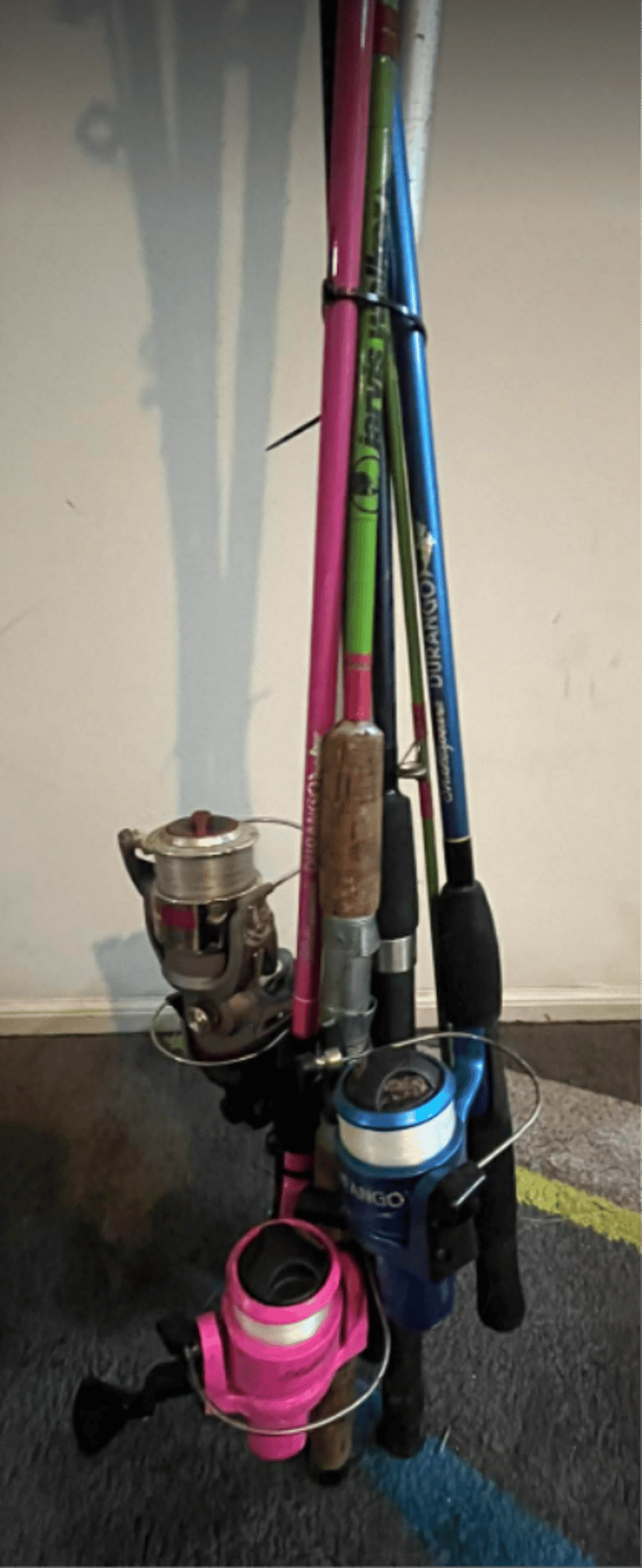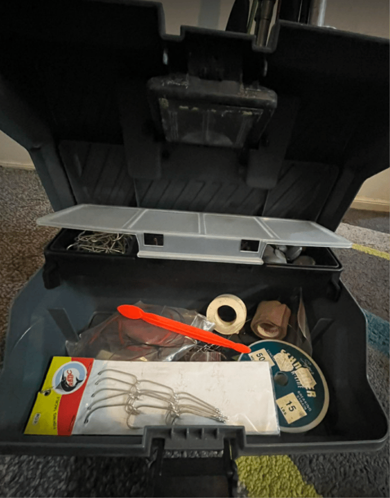 Mixed Fishing Rods, Tackle box (equipped), Fishing Net. (4 Reels & 5 Fishing rods in total). Refer to images.