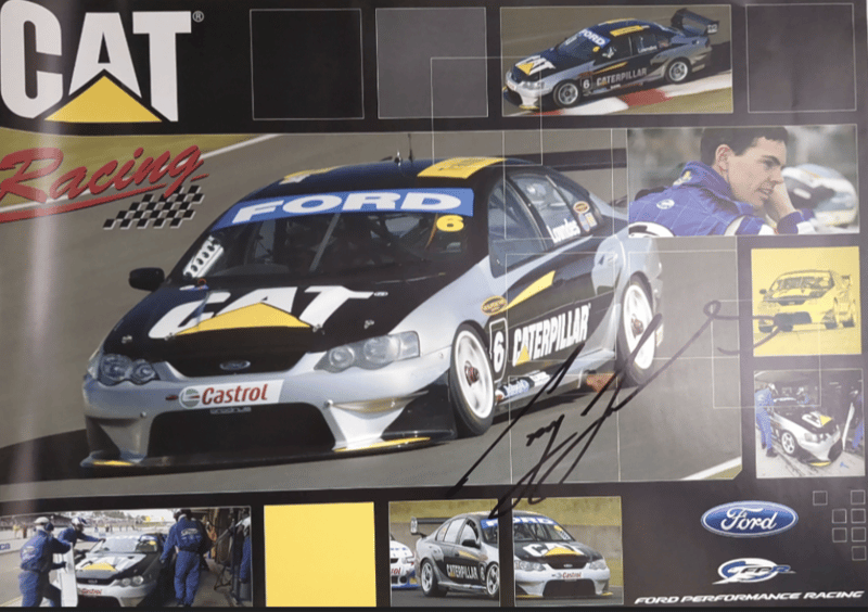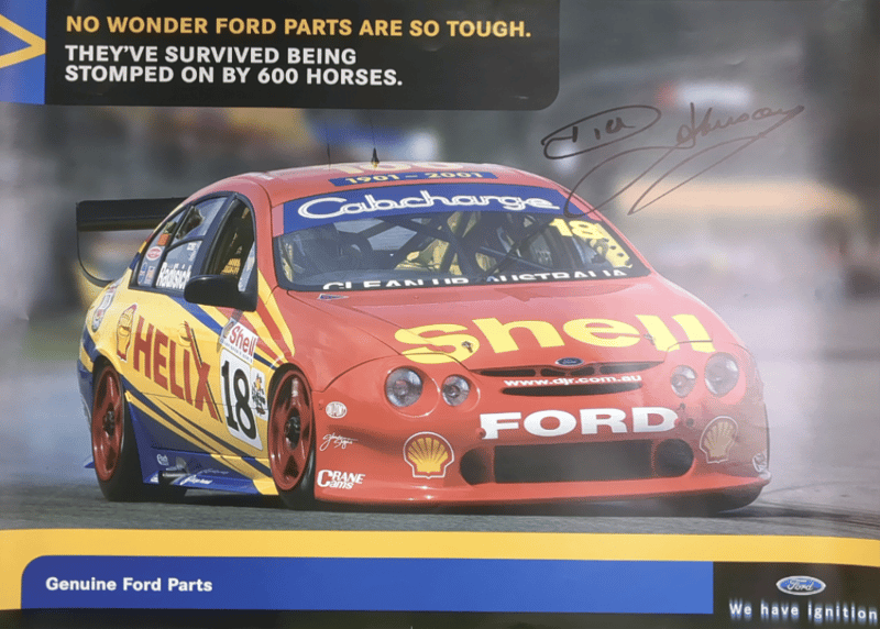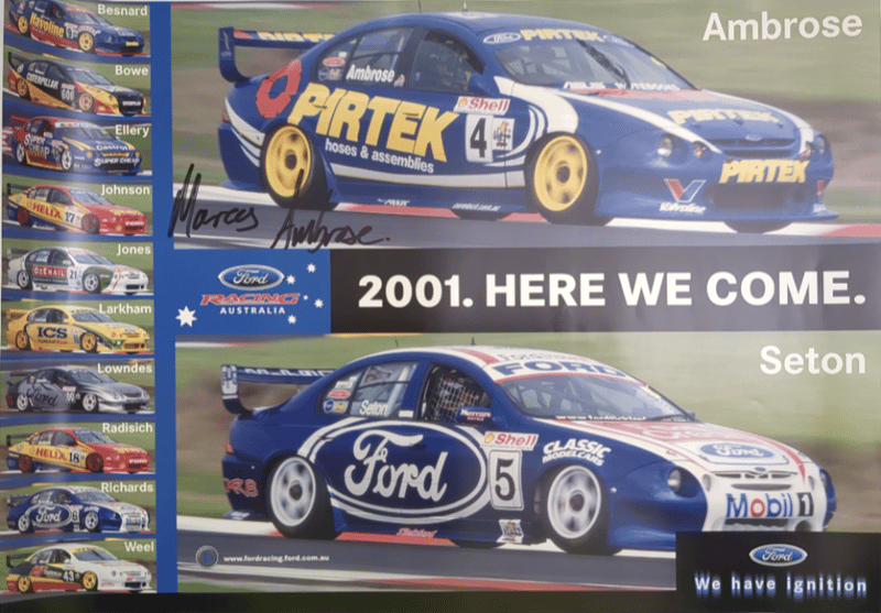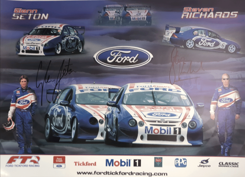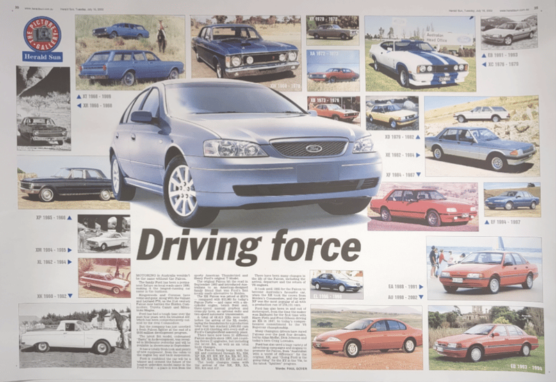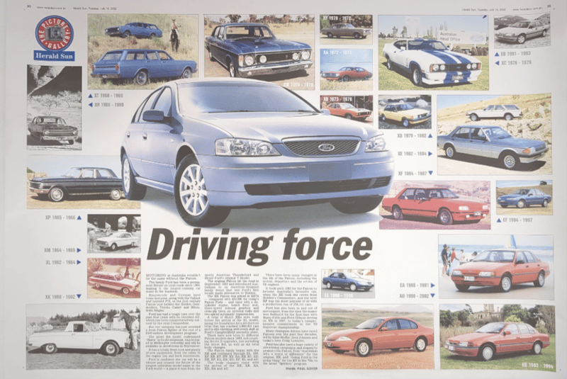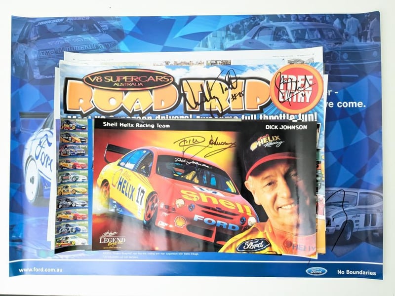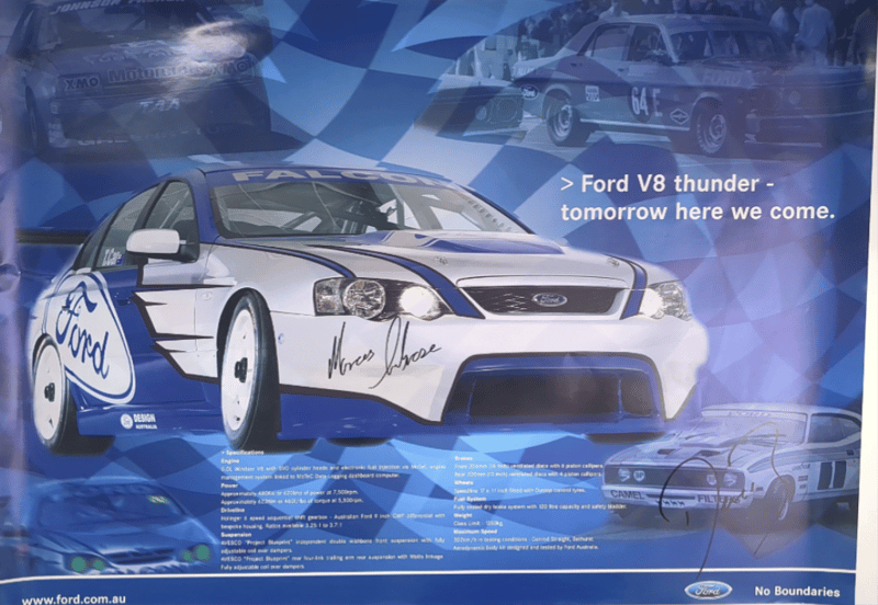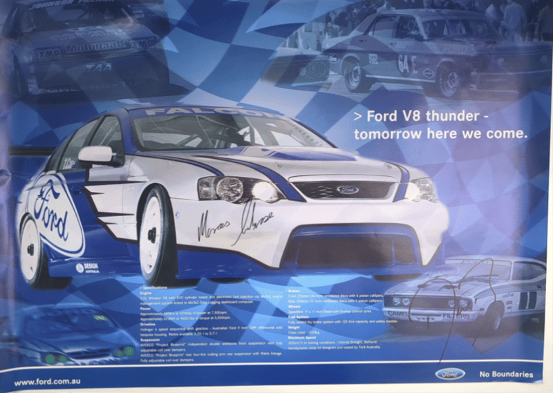 Includes historical collage of the Ford Falcon in Australia, titled "Driving force" by Paul Gover, collectible motorsport poster featuring signatures from racing drivers Peter Brock, Paul Morris, Jason Plato, John Cleland, and Cameron McConville, autographed "New Old Stock" A3 poster featuring the #10 Ford AU Falcon V8 Supercar driven by Mark Larkham and Wayne Gardner at the 2001 Bathurst 1000, and many more.