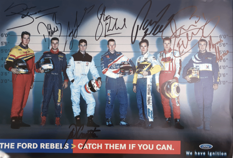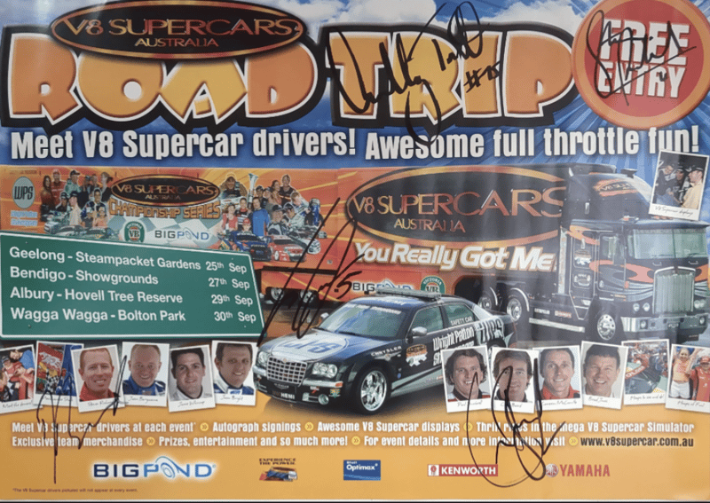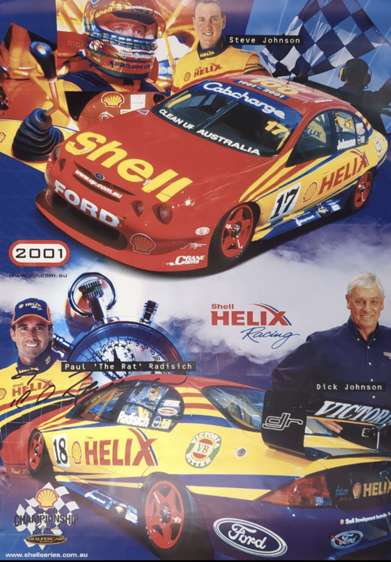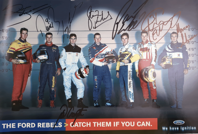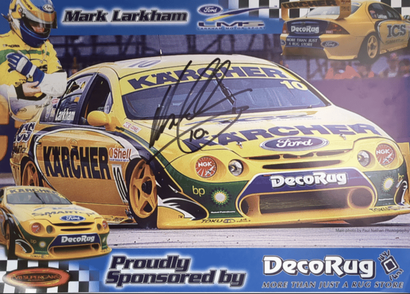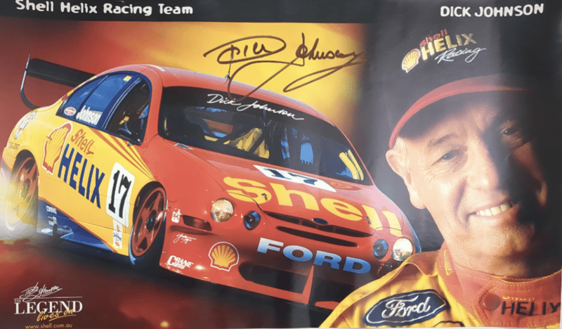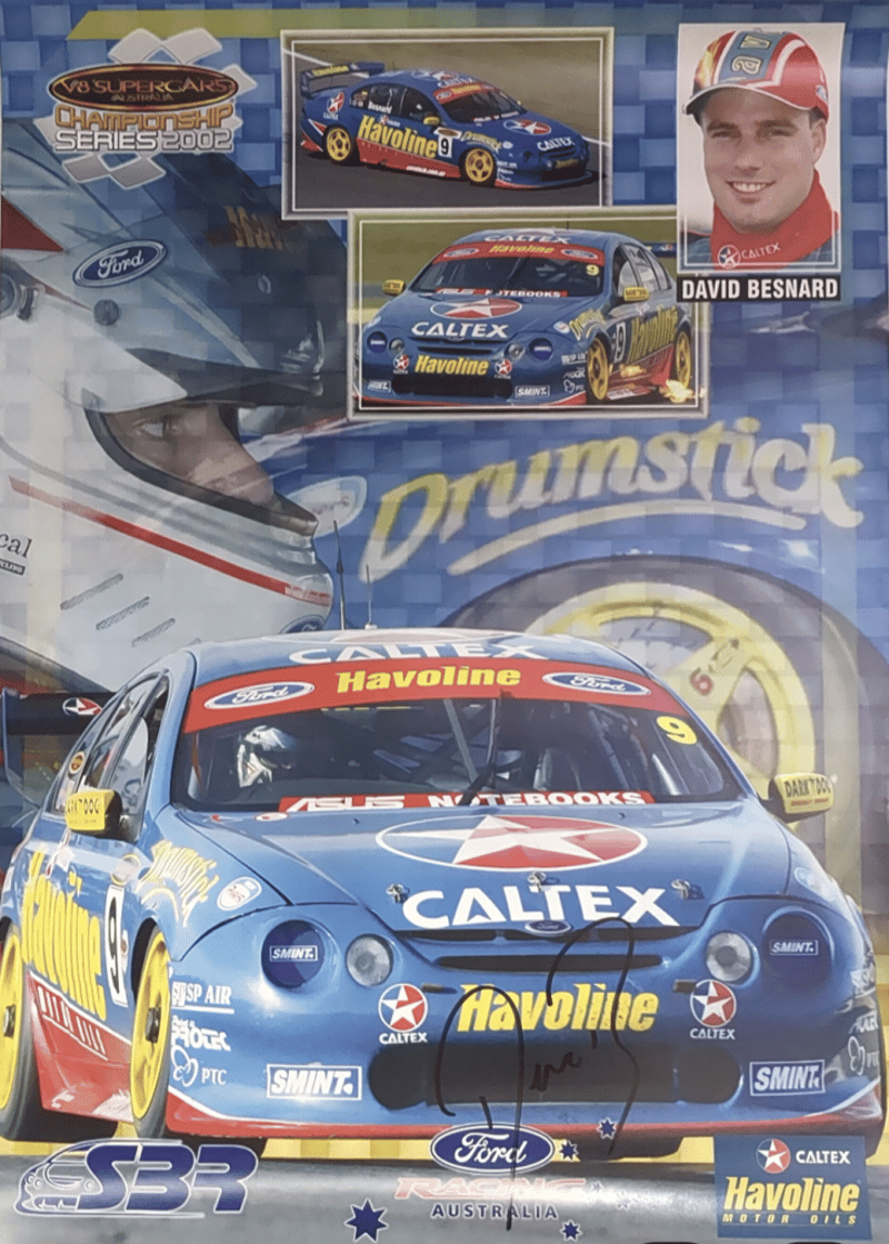 Includes historical collage of the Ford Falcon in Australia, titled "Driving force" by Paul Gover, collectible motorsport poster featuring signatures from racing drivers Peter Brock, Paul Morris, Jason Plato, John Cleland, and Cameron McConville, autographed "New Old Stock" A3 poster featuring the #10 Ford AU Falcon V8 Supercar driven by Mark Larkham and Wayne Gardner at the 2001 Bathurst 1000, and many more.