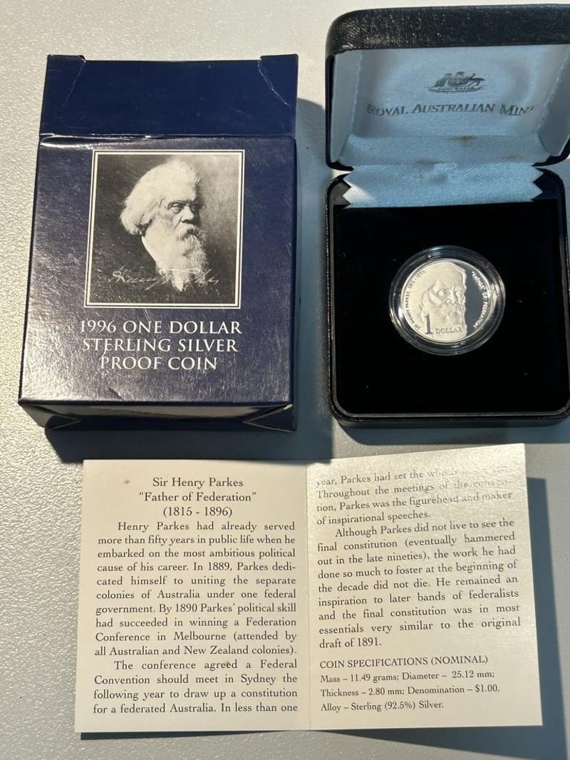 1996 ONE DOLLAR SIR HENRY PARKES FINE PROOF SILVER COIN IN CASE 11.66 Grams Fine Silver Condition: Proof 233553+13
