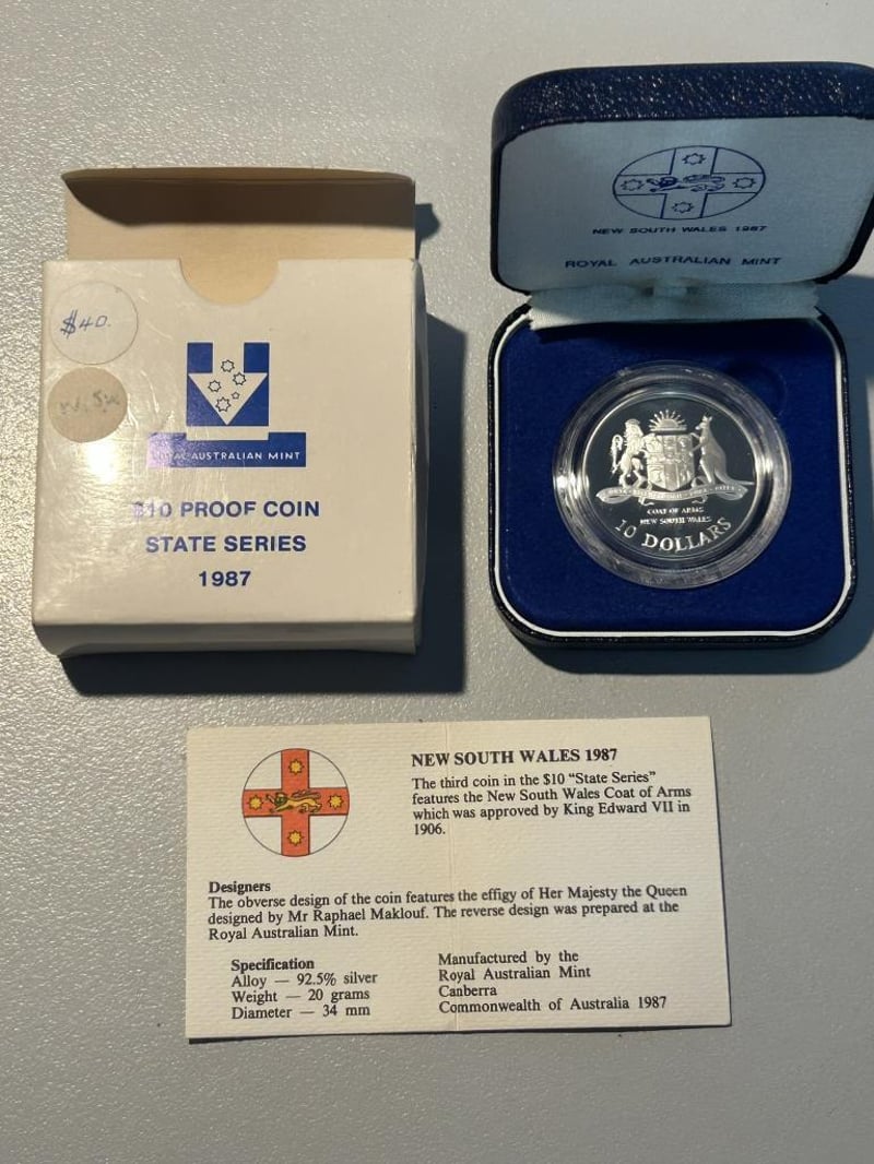 1987TEN DOLLAR N.S.W SILVER PROOF COIN IN CASE 20 Grams 92.5% Silver Condition: Proof 233553+66