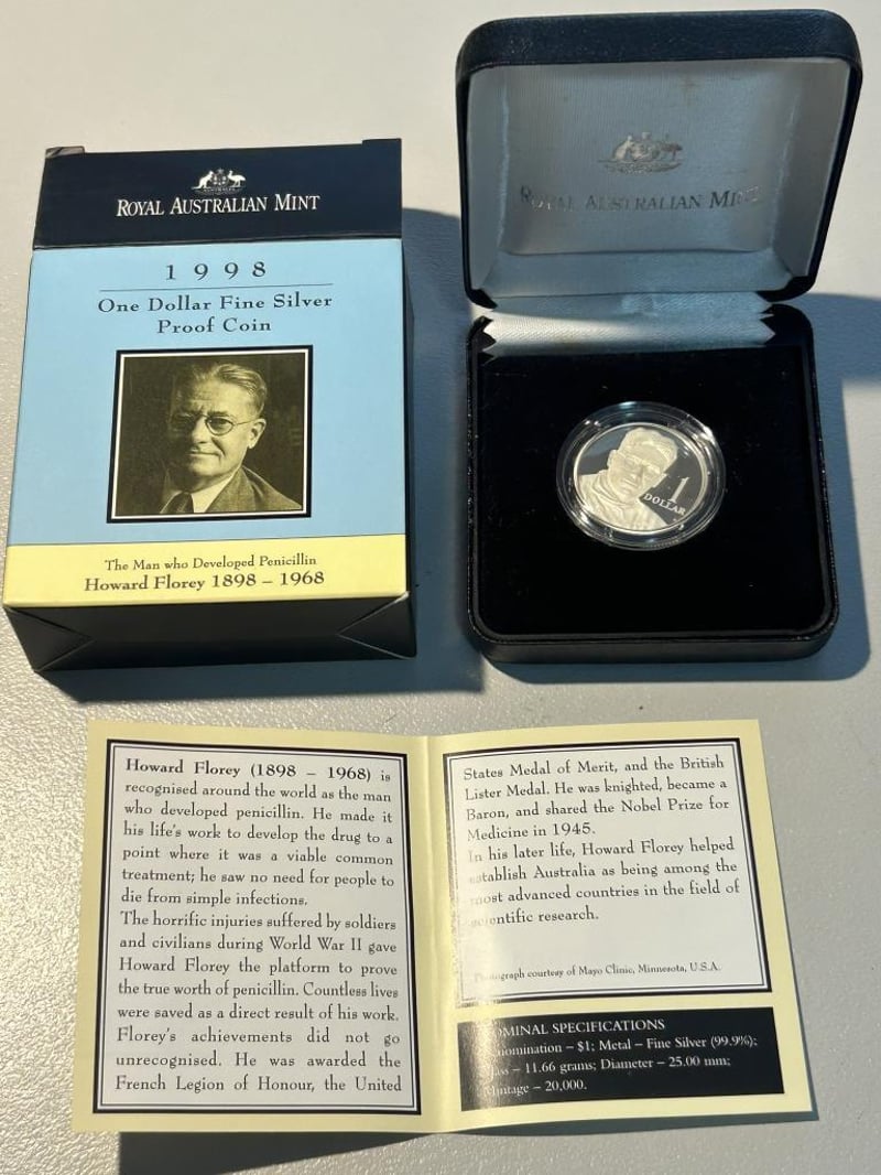 1998 ONE DOLLAR HOWARD FLOREY SILVER PROOF COIN IN CASE 11.66 Grams 99.9% Silver Condition: Proof233553+68