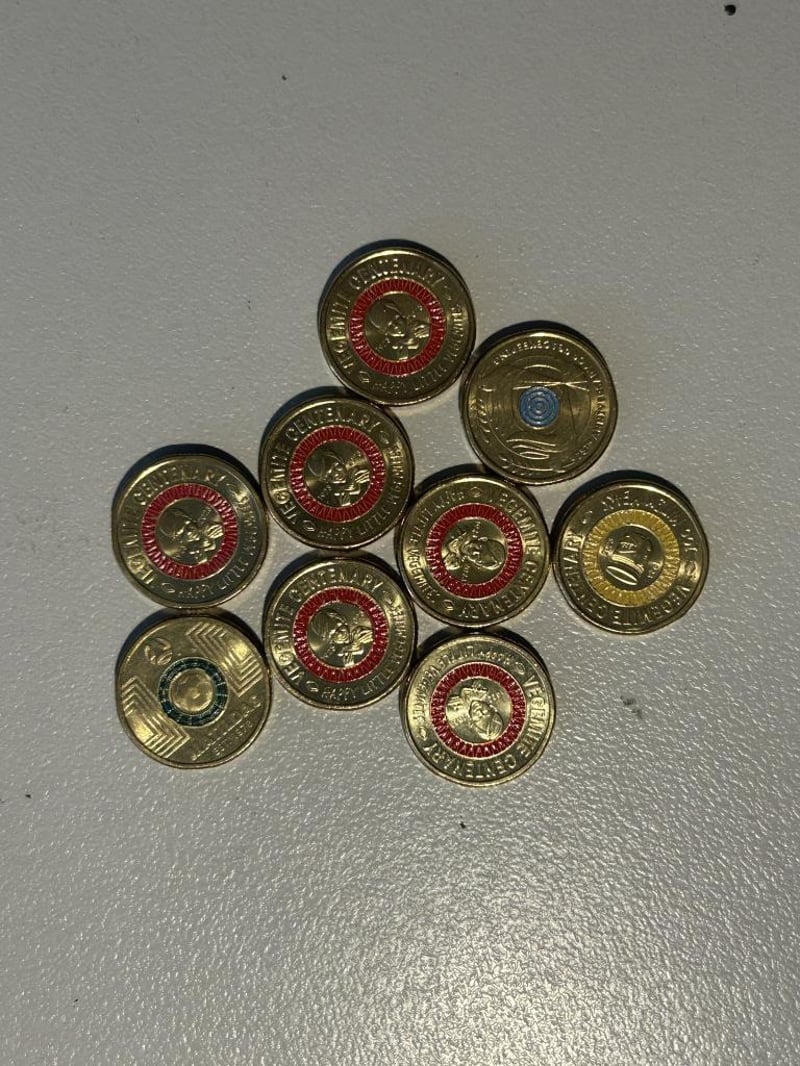 9 X TWO DOLLAR COLOURED COINS 233553+124