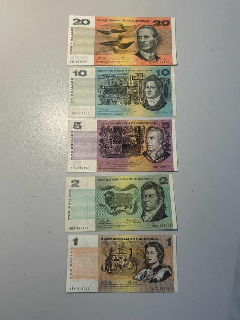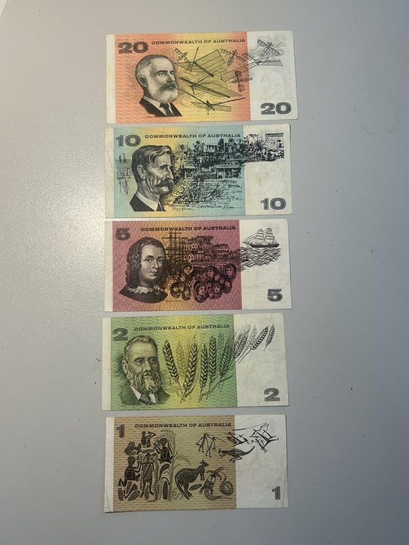 1972 PHILLIPS/WHEELER COMMONWEALTH OF AUSTRALIA NOTE SET $1, $2, $5, $10, $20 NotesCirculated 233554+20