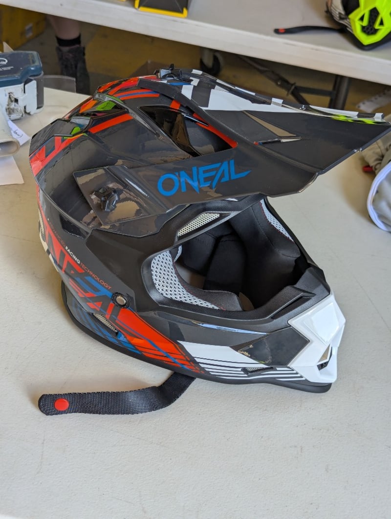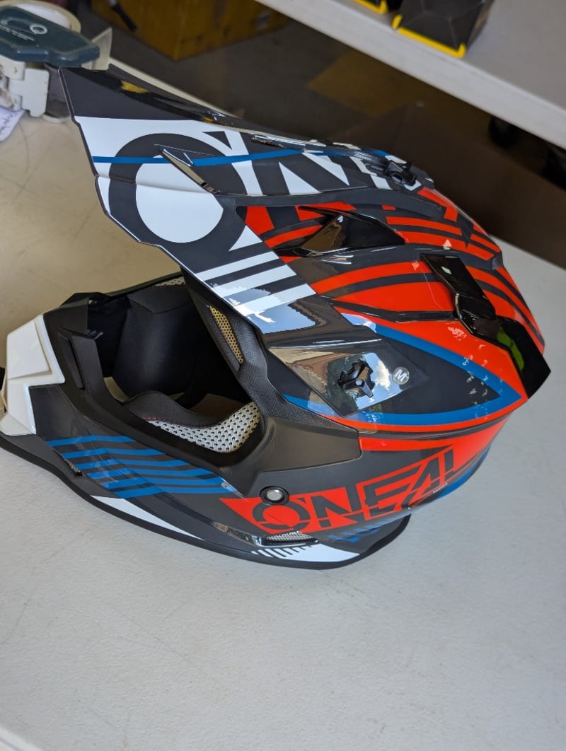 RRP $150 O’NEAL Youth 2 SRS Rush V.22 Helmet - Orange/BlueThe O’NEAL Youth 2 SRS Rush V.2 helmet is built for young riders, offering a lightweight polycarbonate/ABS shell (1150 g in size M) with a plush, removable, and washable liner. It features multiple air vents for optimal cooling, a rubber roost nose guard, and a height-adjustable visor for added customization. With durable multi-colored graphics and a secure Double-D chin strap, this helmet meets DOT and ECE 22-05 safety standards for maximum protection.