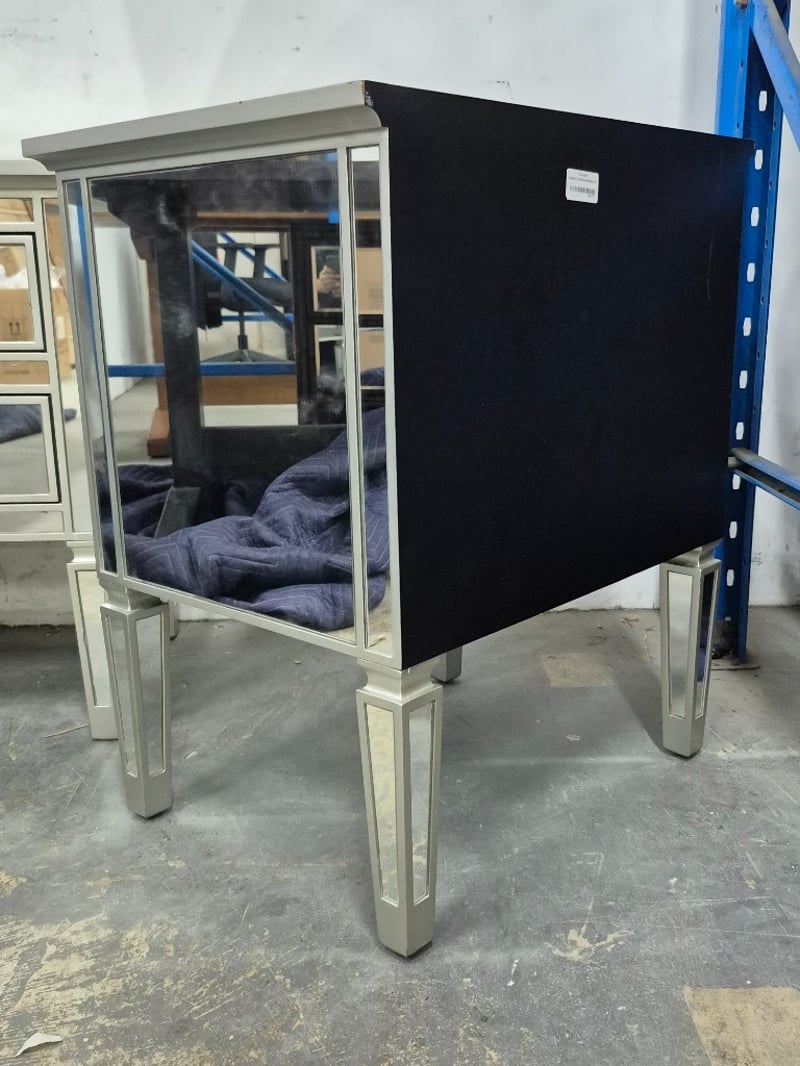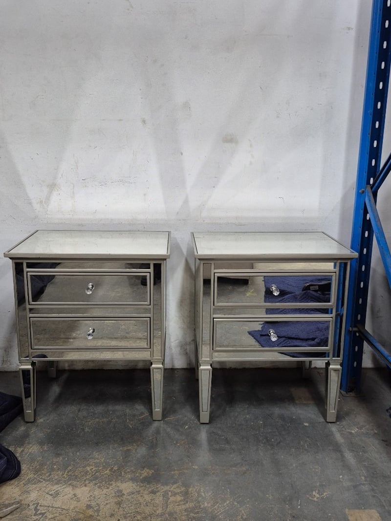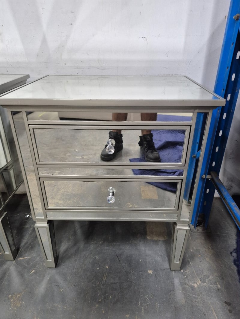 Bedside table mirrors finish with fake crystal handlesDimensions Height:72 cm Width: 61cm Depth: 47cm Bid per item, must take 2