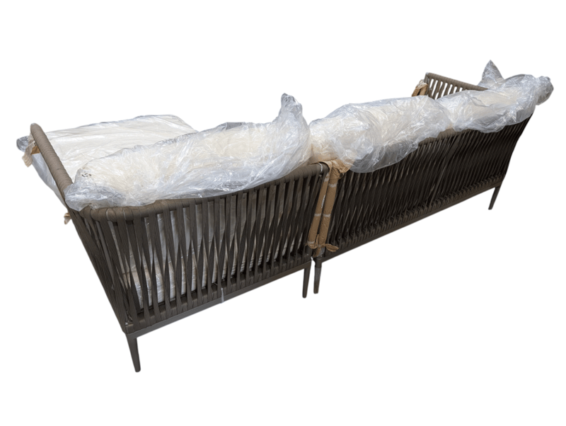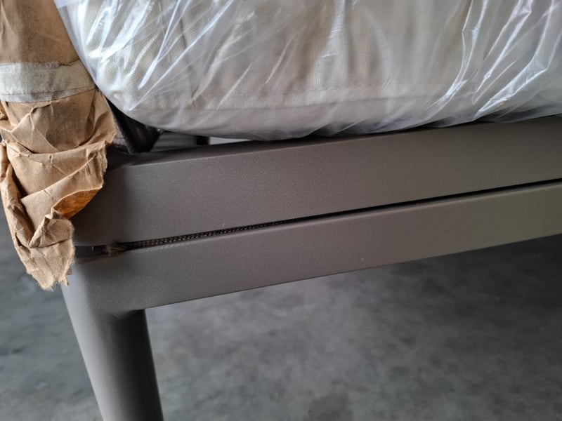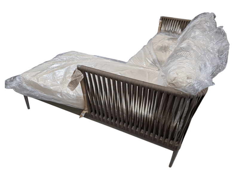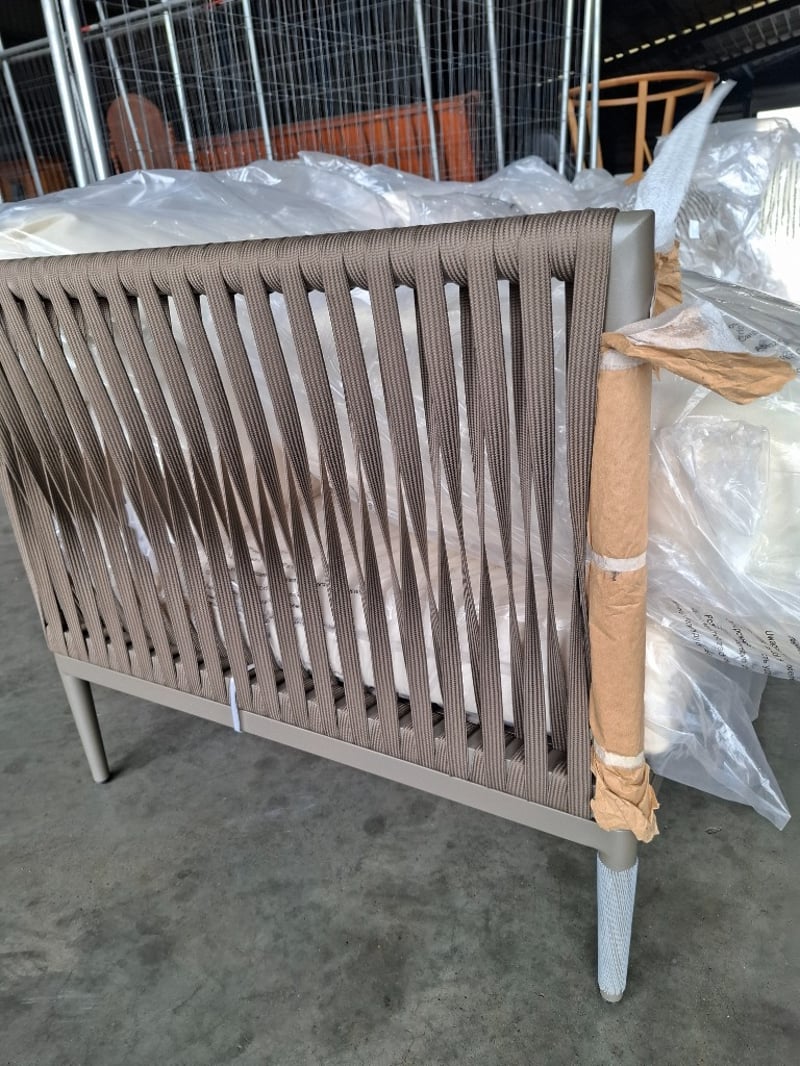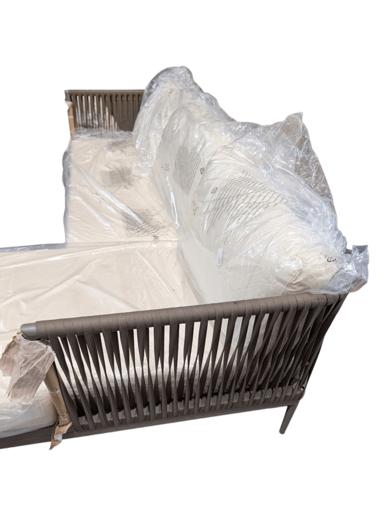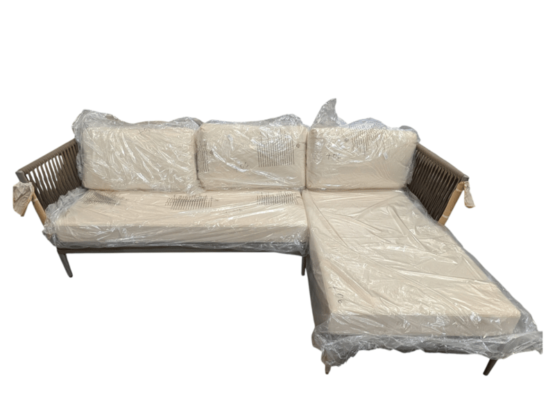 Casa blanca left sofa , cream fabric, light grey metal frame with straps