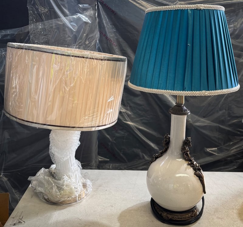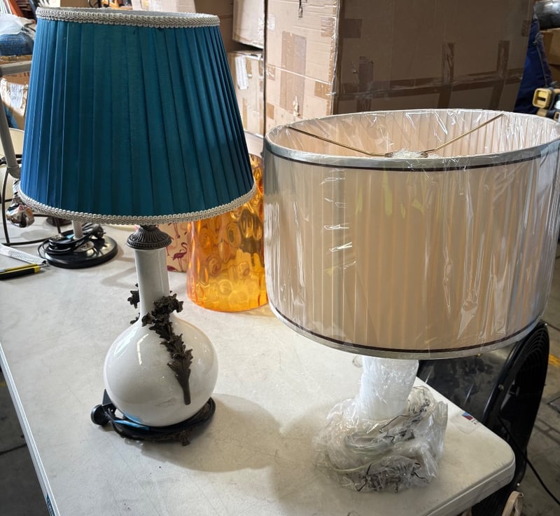 Metal and porcelain lamp bases with shades Note; Sold as lot