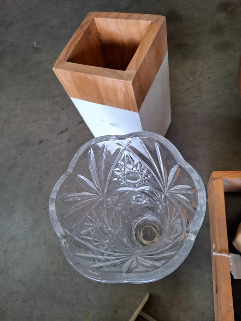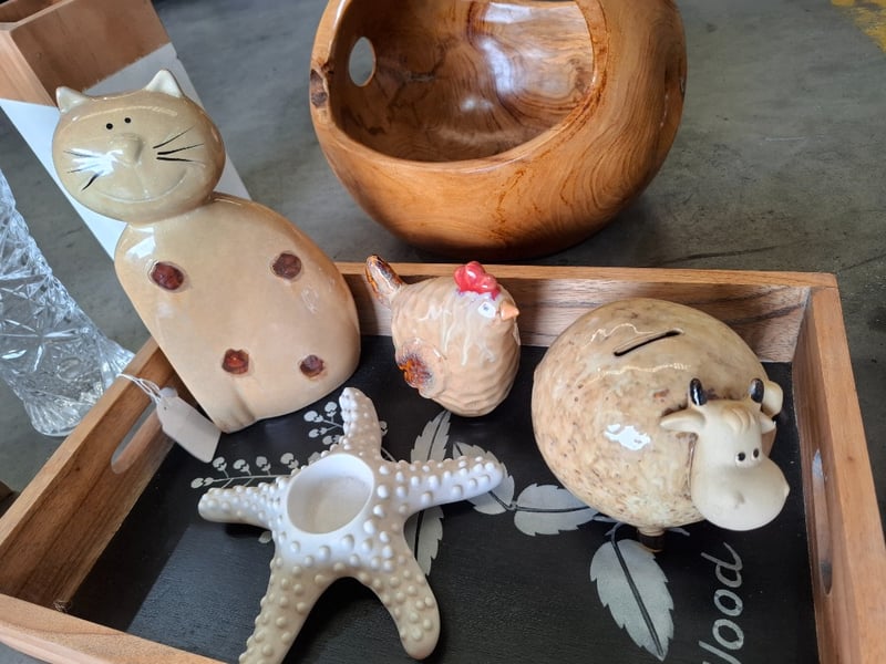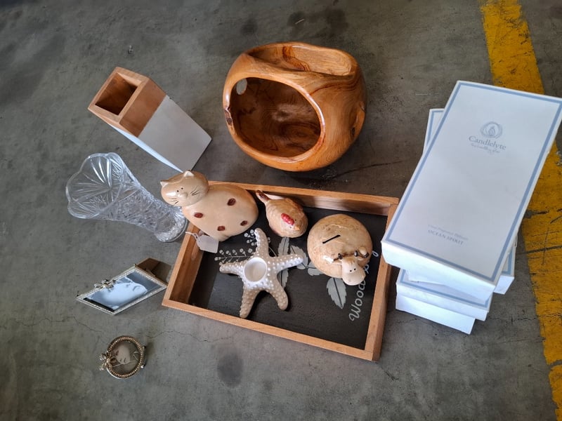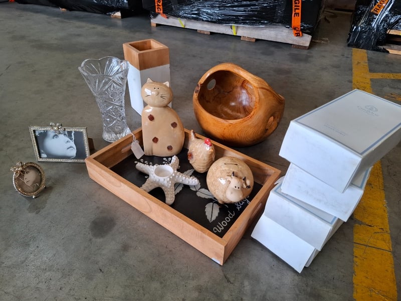 Assortment lot of decorative ornaments includes wood tray, coral fragrance diffuser, pictures frame and moreSold as lot
