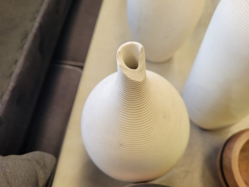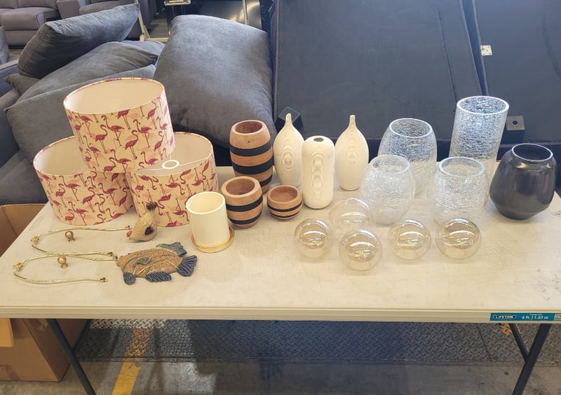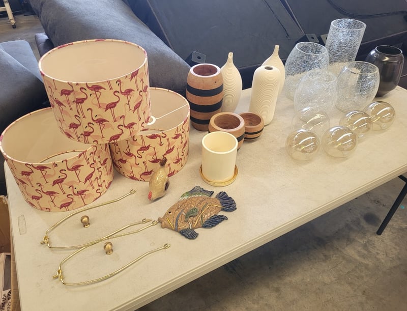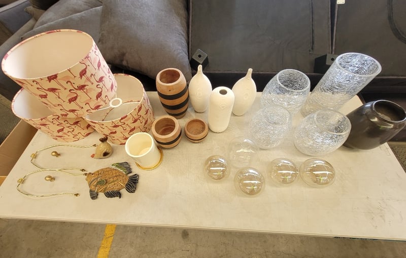 Assorted Light Shades and Vases Patterned light shades, glass, timber and ceramic vases, x2 small ornaments note some damages, sizes vary.