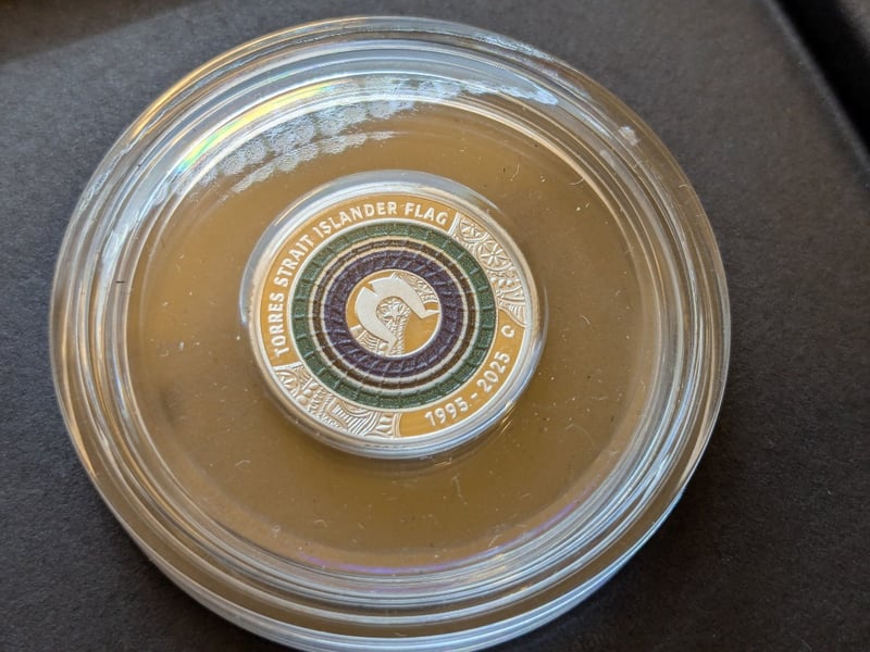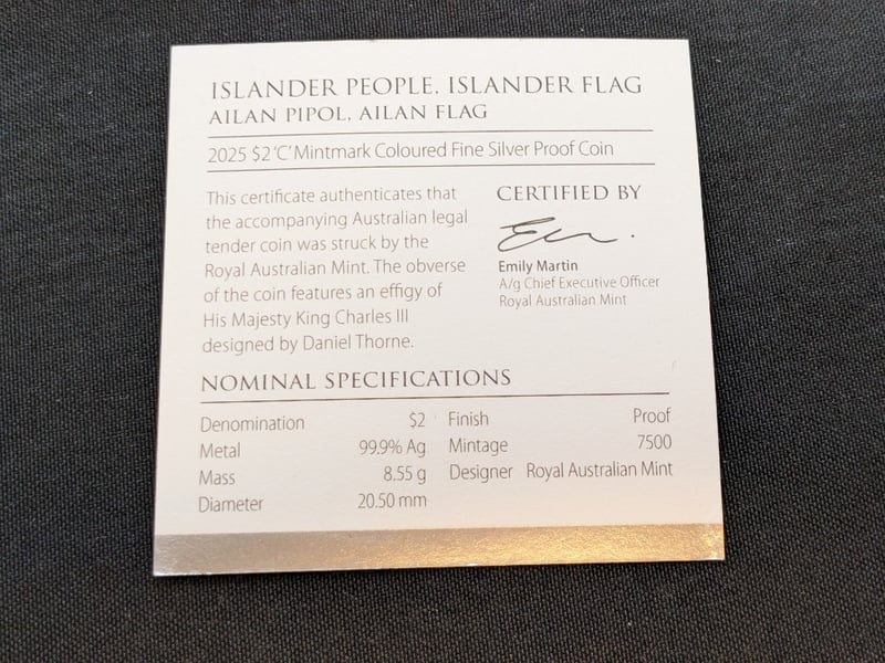 ROYAL AUSTRALIAN MINT 2025 TWO DOLLAR 'C' MINT MARK COLOURED FINE SILVER PROOF COIN - TORRES STRAIT ISLANDER FLAGIncludes Certificate Of AuthenticityCondition: Proof584429+80