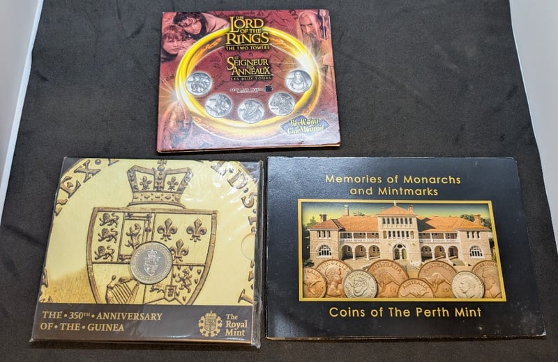 COLLECTION OF COMMEMORATIVE COIN SETSIncludes Reel Coinz 2002 Lord Of The Rings: The Twin Towards Five Coin Set, The Royal Mint 350Th Anniversary Of The Guinea Two Pound Coin, The Perth Mint Memories Of Monarchs And Mintmarks Five Coin SetCondition: Aunc584429+87