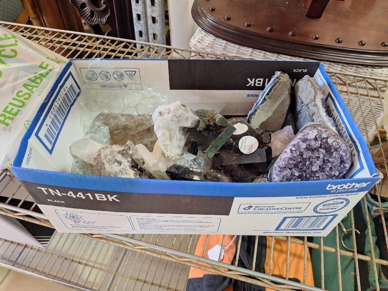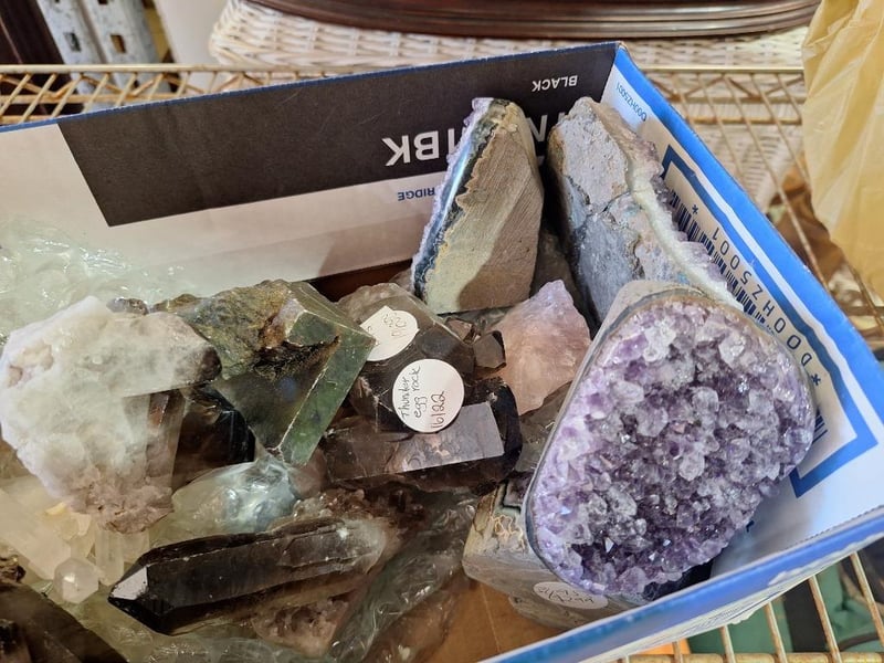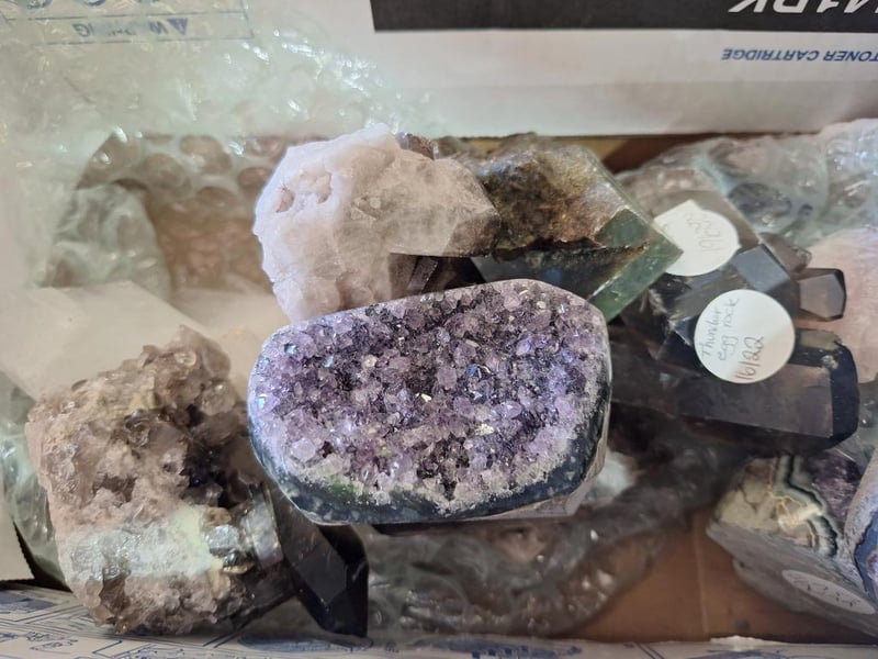 Variety of natural quartz geodes and rocks, includes natural New Zealand jade, amethyst, smokey quartz, thunder egg rock