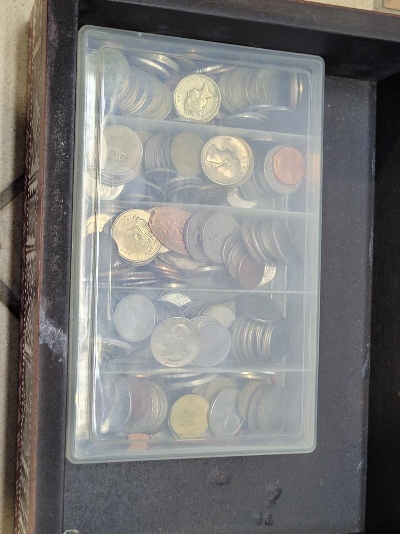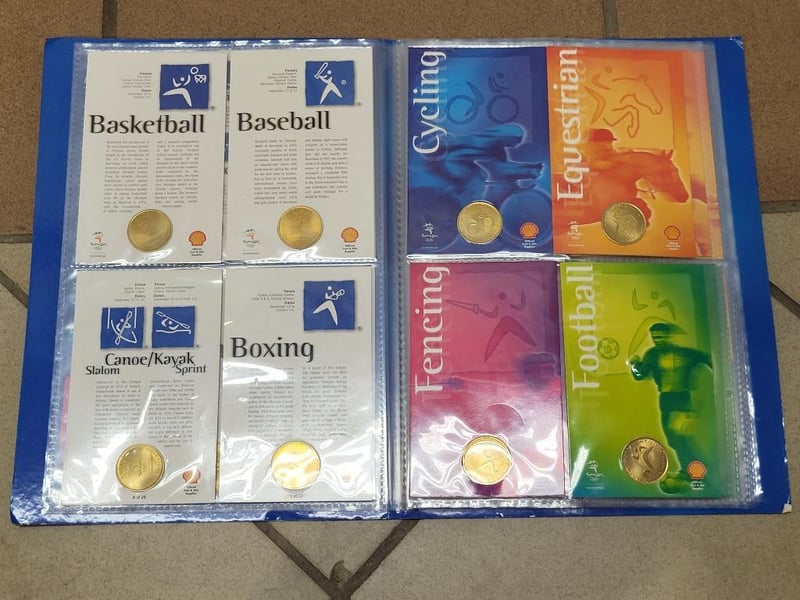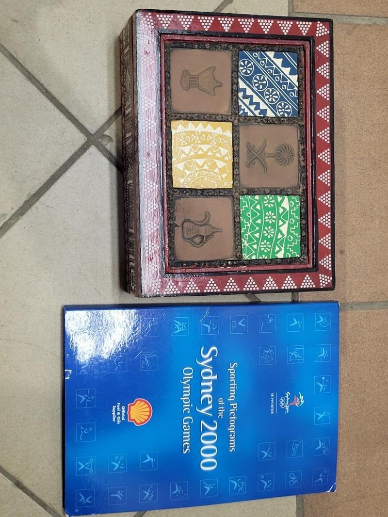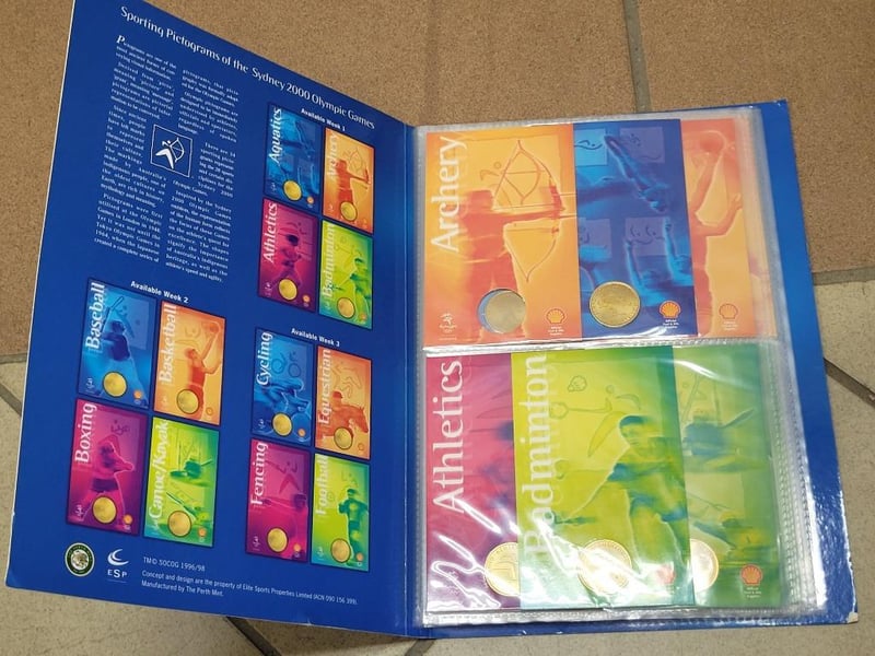 Variety of international coins, comes with handcrafted wooden decorative dot-painted box, 1x Sydney 2000 Olympic coin collection, sporting pictograms book