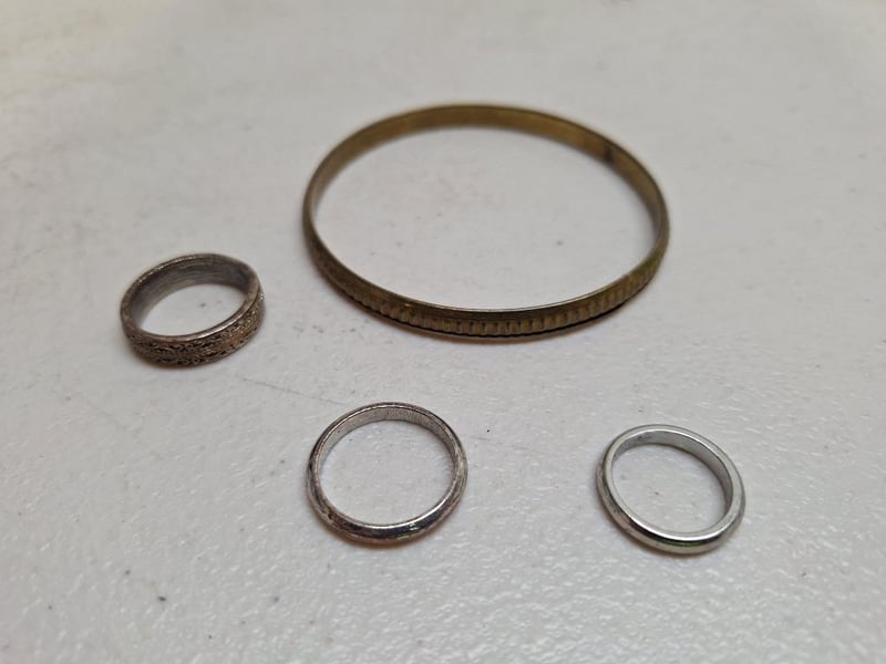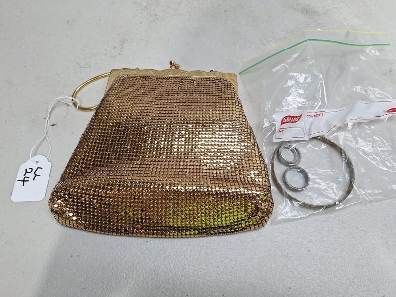 Glomesh Gold Handbag, gold satin lining, 3 silver-tone rings & 1 gold-tone bangle.