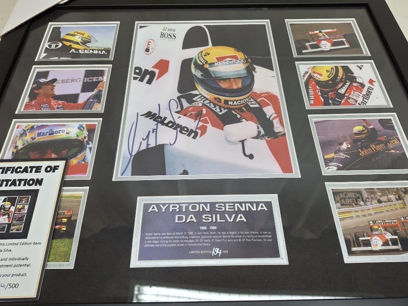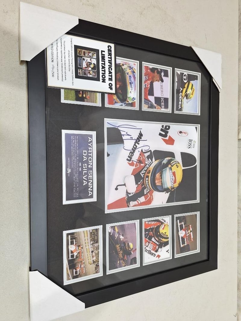 1x framed Ayrton Senna da Silva memorabilia collage, formula one, comes with COA numbered 194/500