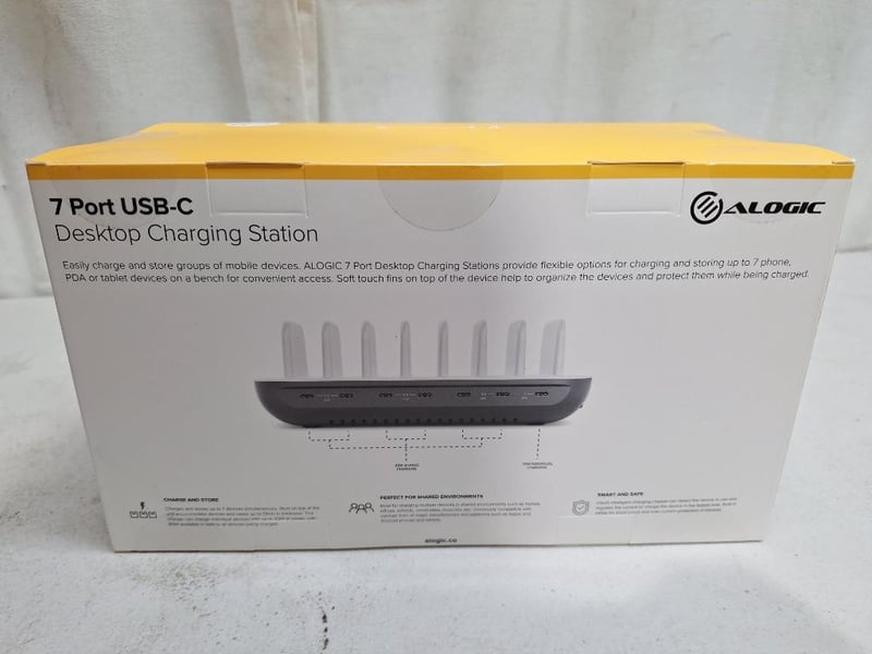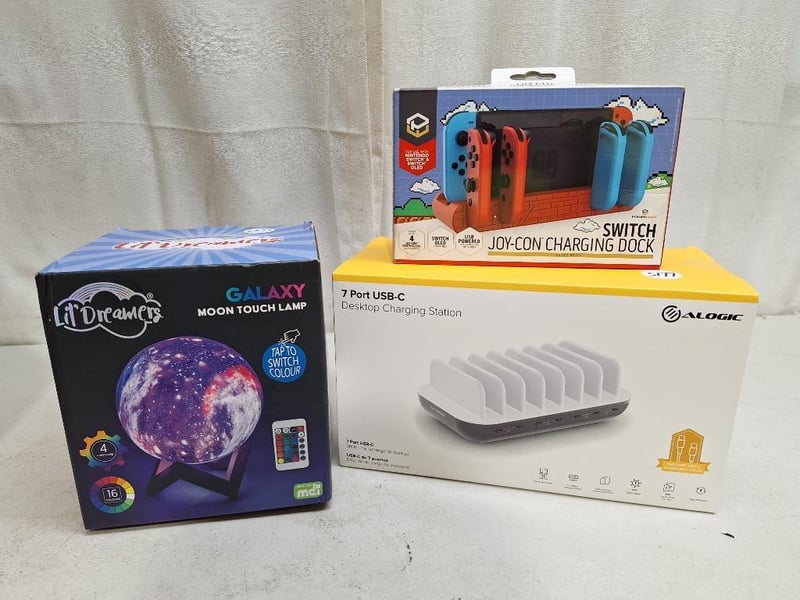 1 x ALOGIC 7 port USB-C desktop charging station, RRP:$109.95, NEW factory sealed in box, 1 x LIL' DREAMERS galaxy moon touch lamp, RRP:$40.00, NEW factory sealed in box, 1 x POWERWAVE SWITCH joy-con charging dock, NEW in box