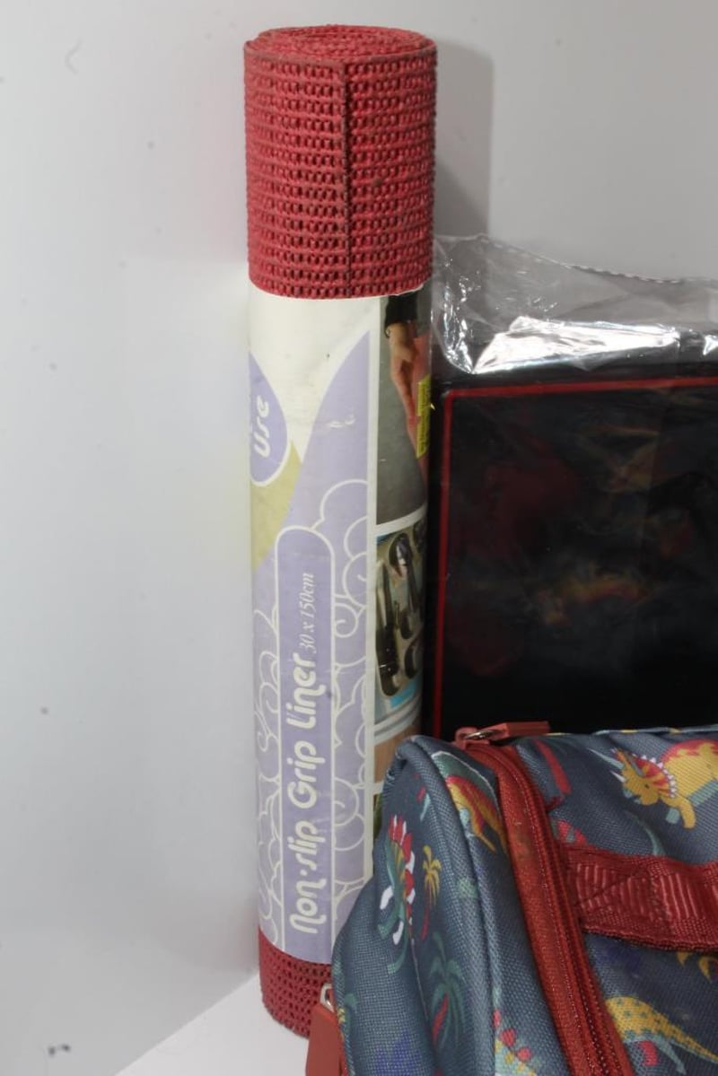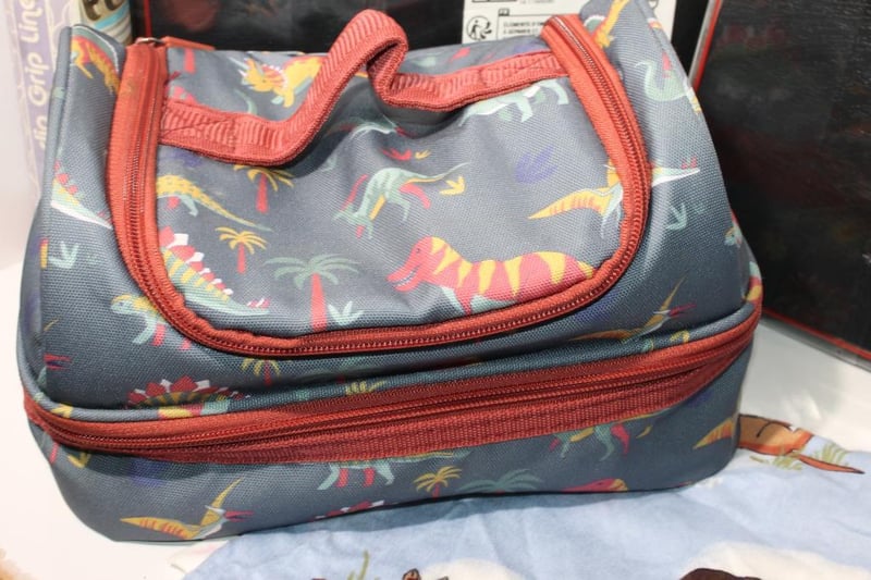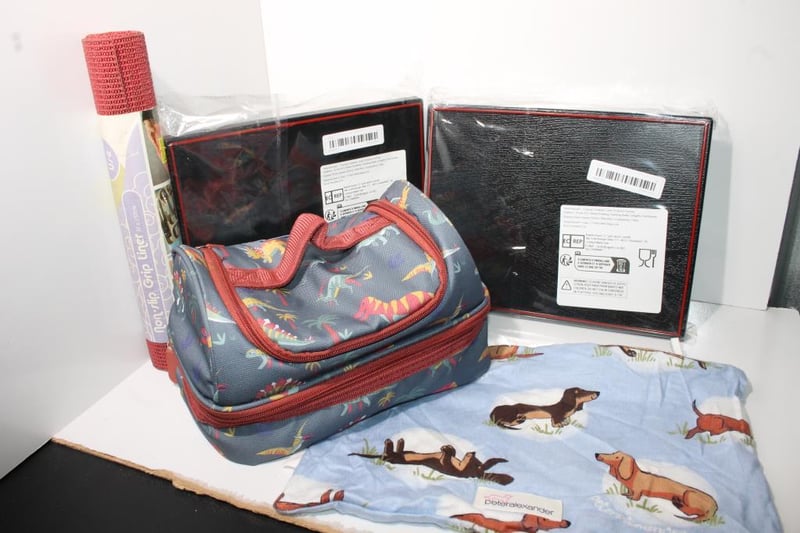 2 X Bento Boxes & Kids Cooler bag, Mats & Grip LinerIncludes insulated dinosaur print lunch bag, two black bento boxes (sealed), roll of non-slip grip liner, and a Peter Alexander dachshund print fabric item.