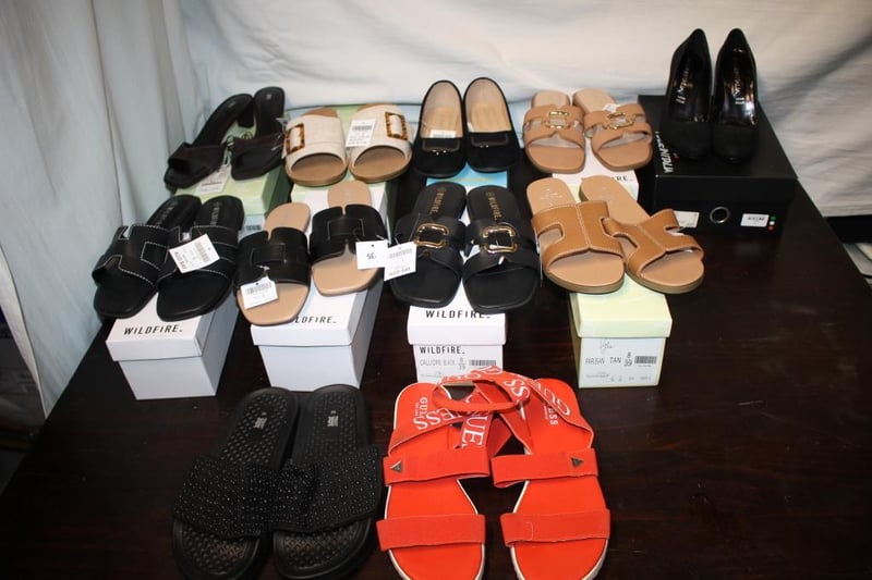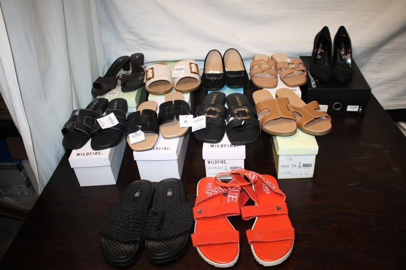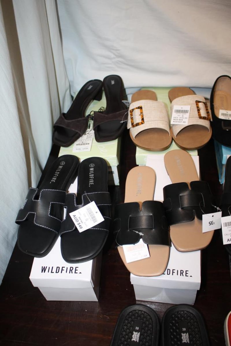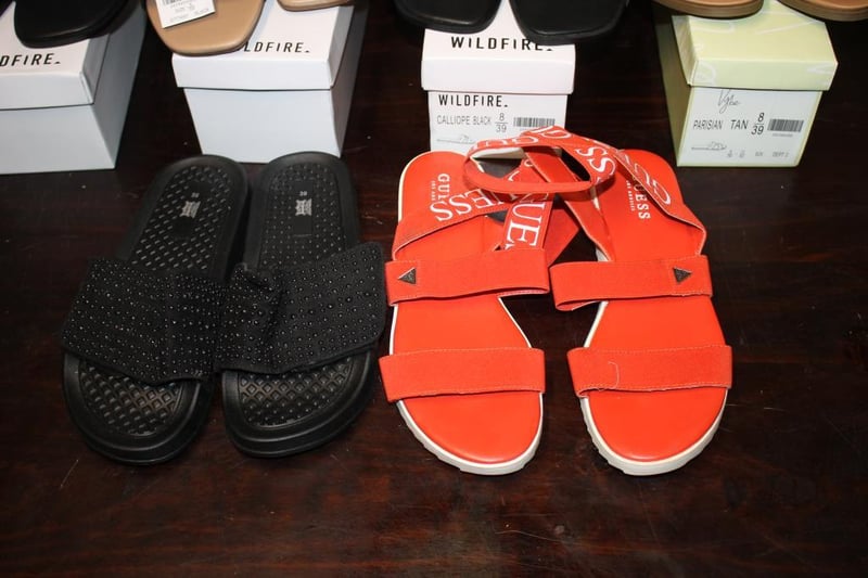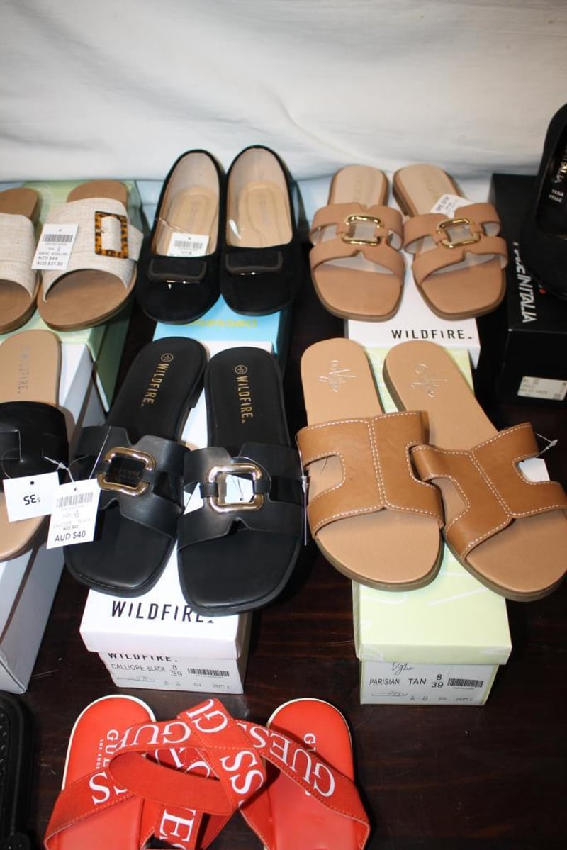 Mixed lot of women’s sandals and heels including Wildfire slides (various styles), Guess red strap sandals, and Made in Italy black heels (Vera Pelle).
