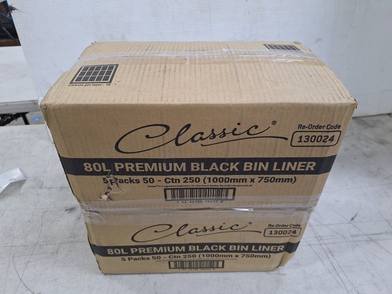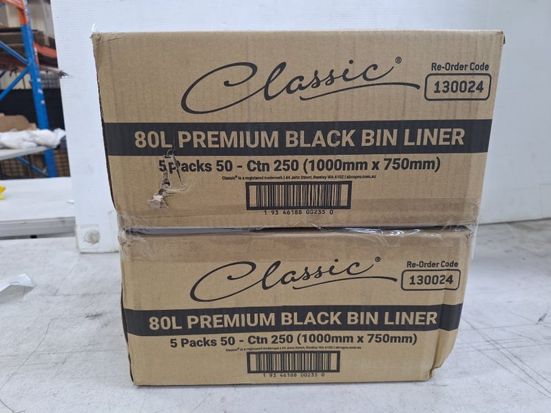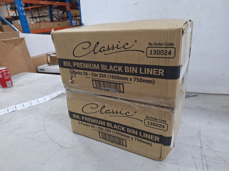 80L Premium Black Bin Liners, Classic, 2 x Cartons Of 250, 1000mm x 750mm Sold As Lot