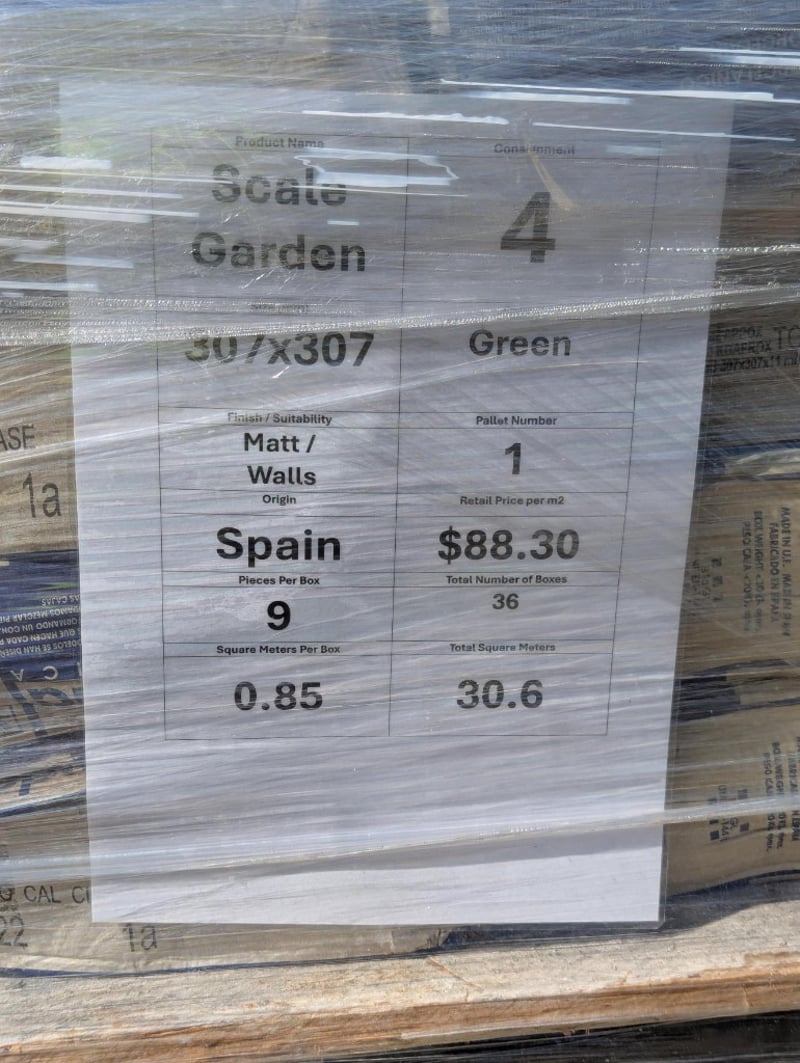 Wall Tiles, Scale Garden, Green Colour, Spain Origin, Approximate Quantity of 324 Tiles, (30.6 Total Square Meters)Approximate Dimensions: 307mm x 307mmSOLD AS LOT