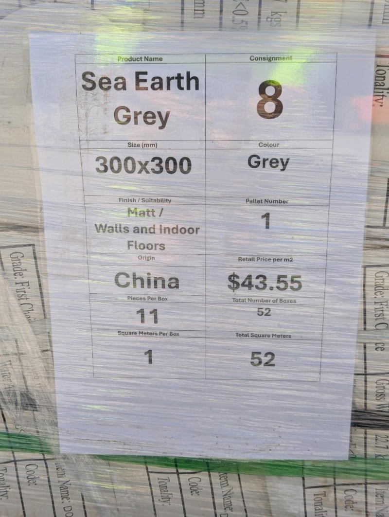 Wall and Indoor Floor Tiles, Sea Earth Grey, Grey Colour, China Origin, Approximate Quantity of 572 Tiles, (52 Total Square Meters)Approximate Dimensions: 300mm x 300mmSOLD AS LOT