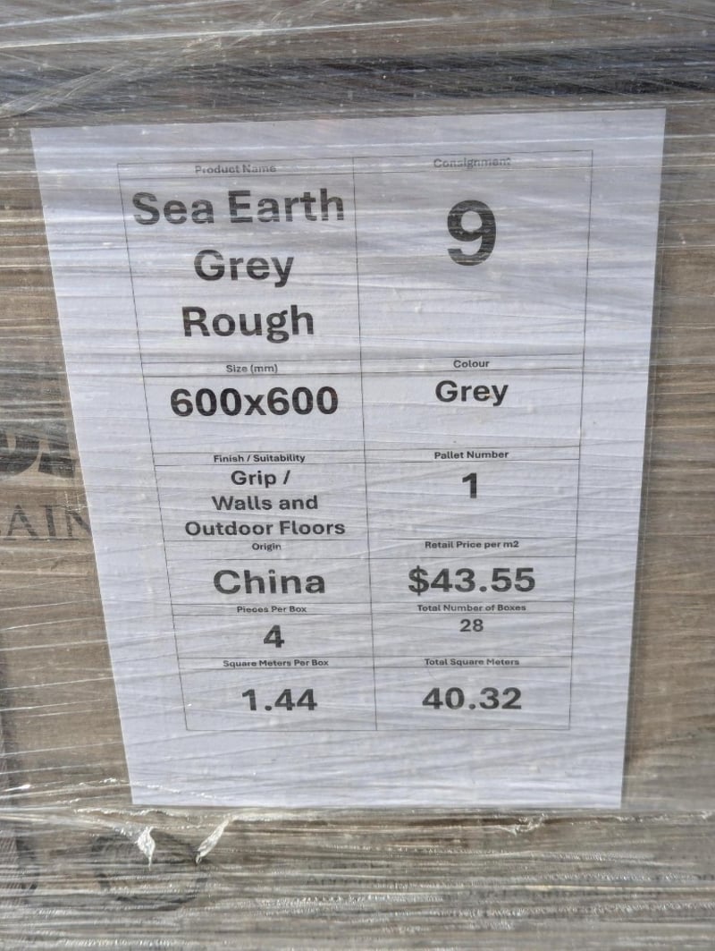 Wall and Outdoor Floor Tiles, Sea Earth Grey Rough, Grey Colour, China Origin, Approximate Quantity of 112 Tiles, (40.32 Total Square Meters)Approximate Dimensions: 600mm x 600mmSOLD AS LOT