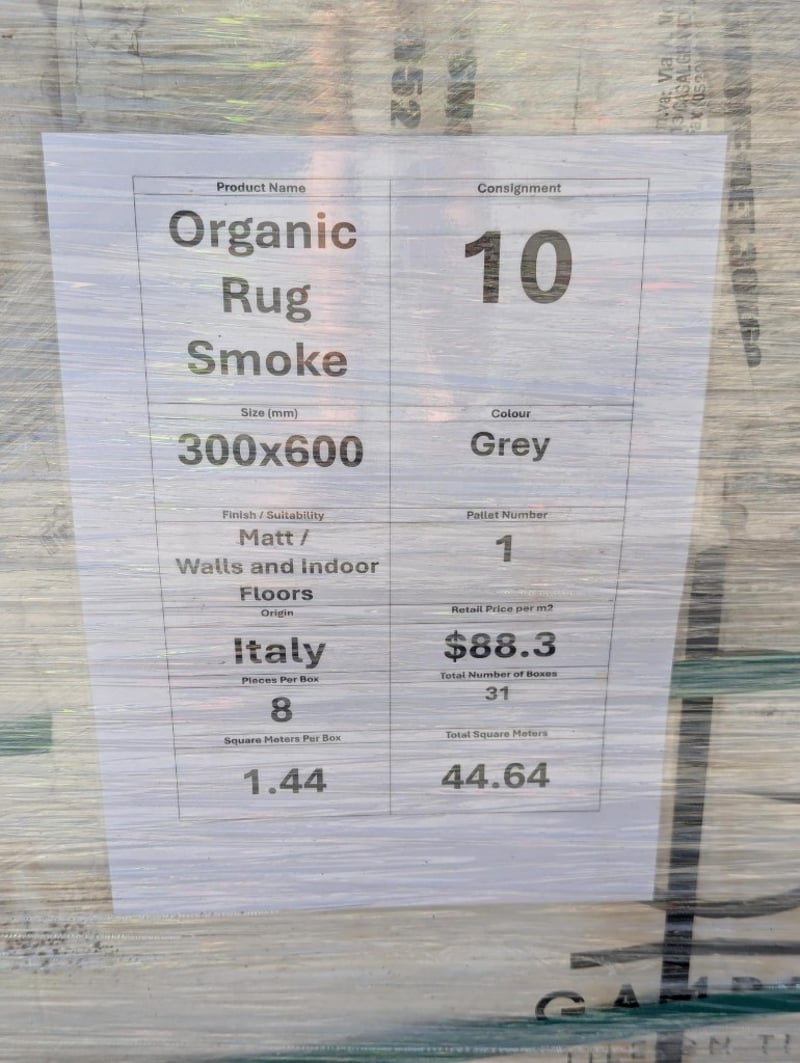 Wall and Indoor Floor Tiles, Organic Smoke Rug, Grey Colour, Italy Origin, Approximate Quantity of 248 Tiles, (44.64 Total Square Meters)Approximate Dimensions: 300mm x 600mmSOLD AS LOT
