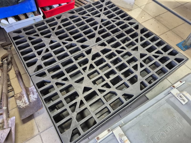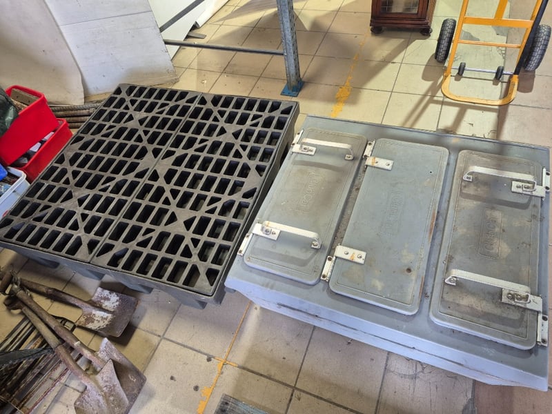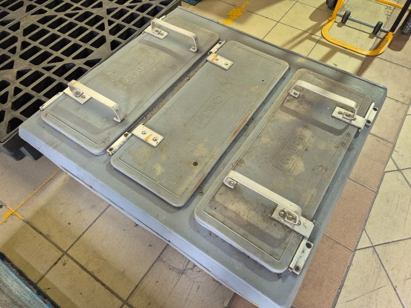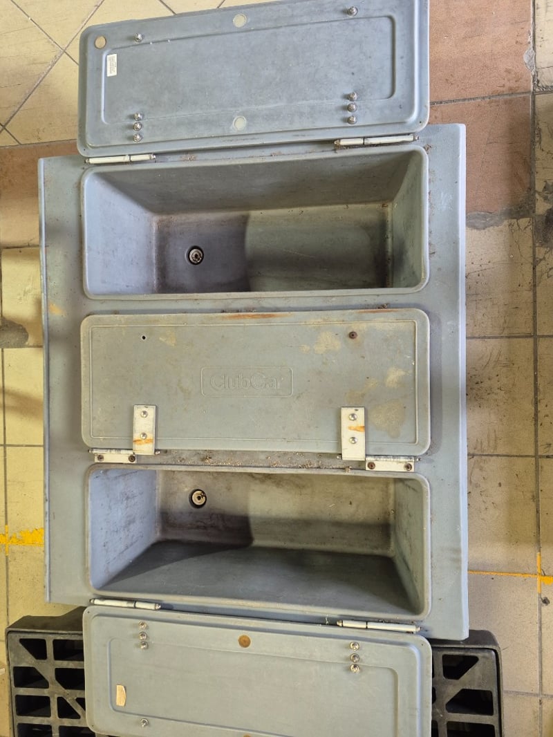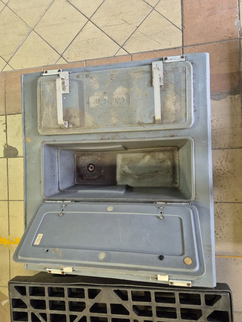 Heavy duty industrial equipment, includes grated platform and club car food container