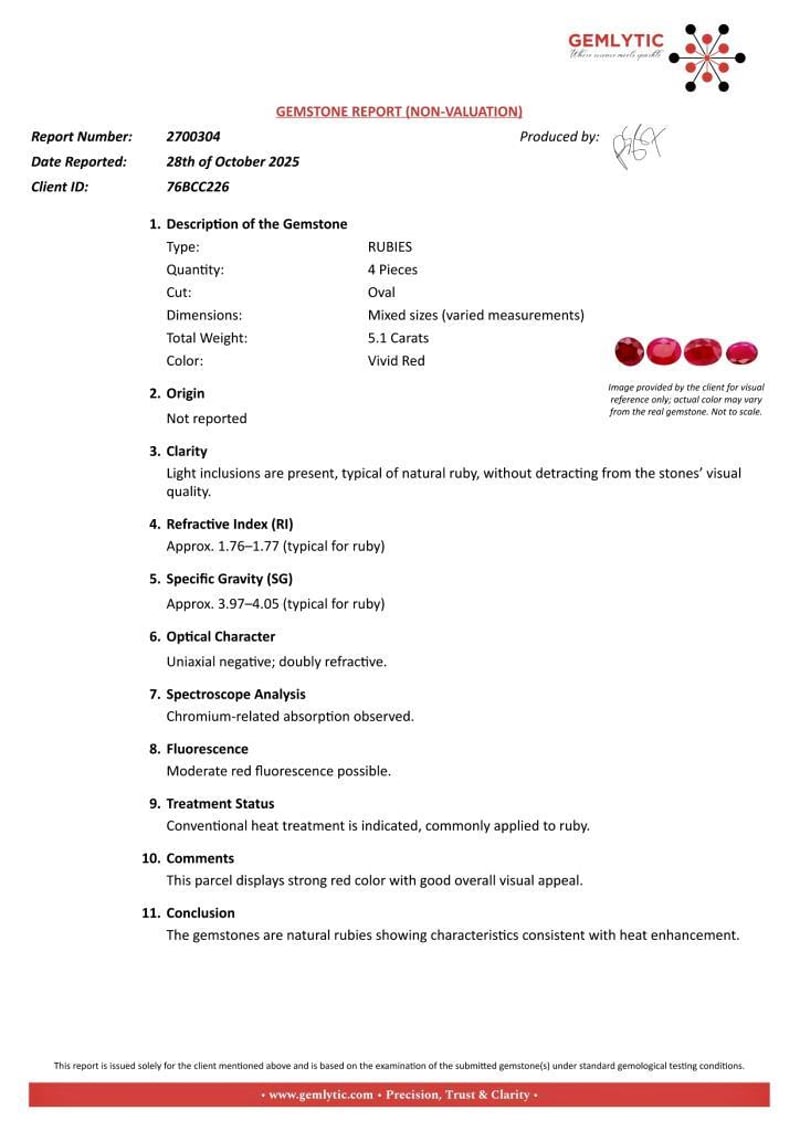 RUBIES - 5.1 CARATS - VIVID RED Quantity: 4 PcsReport Number: 2700304Clarity: Light Inclusions Are Present, Typical Of Natural Ruby, Without Detracting From The Stones’ Visual Quality.Measurements: Mixed SizesTreatments: Conventional Heat Treatment Is Indicated, Commonly Applied To Ruby.Origin: Not ReportedRefractive Index: Approx. 1.76–1.77 (Typical For Ruby)Specific Gravity: Approx. 3.97–4.05 (Typical For Ruby)Spectroscope Analysis: Chromium-Related Absorption Observed.Fluorescence: Moderate Red Fluorescence Possible.Comments: This Parcel Displays Strong Red Color With Good Overall Visual Appeal.Conclusion: The Gemstones Are Natural Rubies Showing Characteristics Consistent With Heat Enhancement. Condition: Good - Refer Images 0488985+7