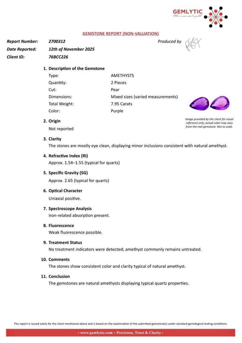 AMETHYSTS - 7.95 CARATS - PURPLE Quantity: 2 PcsReport Number: 2700312Clarity: The Stones Are Mostly Eye Clean, Displaying Minor Inclusions Consistent With Natural Amethyst.Measurements: Mixed SizesTreatments: No Treatment Indicators Were Detected; Amethyst Commonly Remains Untreated.Origin: Not ReportedRefractive Index: Approx. 1.54–1.55 (Typical For Quartz)Specific Gravity: Approx. 2.65 (Typical For Quartz)Spectroscope Analysis: Iron-Related Absorption Present.Fluorescence: Weak Fluorescence Possible.Comments: The Stones Show Consistent Color And Clarity Typical Of Natural Amethyst.Conclusion: The Gemstones Are Natural Amethysts Displaying Typical Quartz Properties. Condition: Good - Refer Images 0488985+15