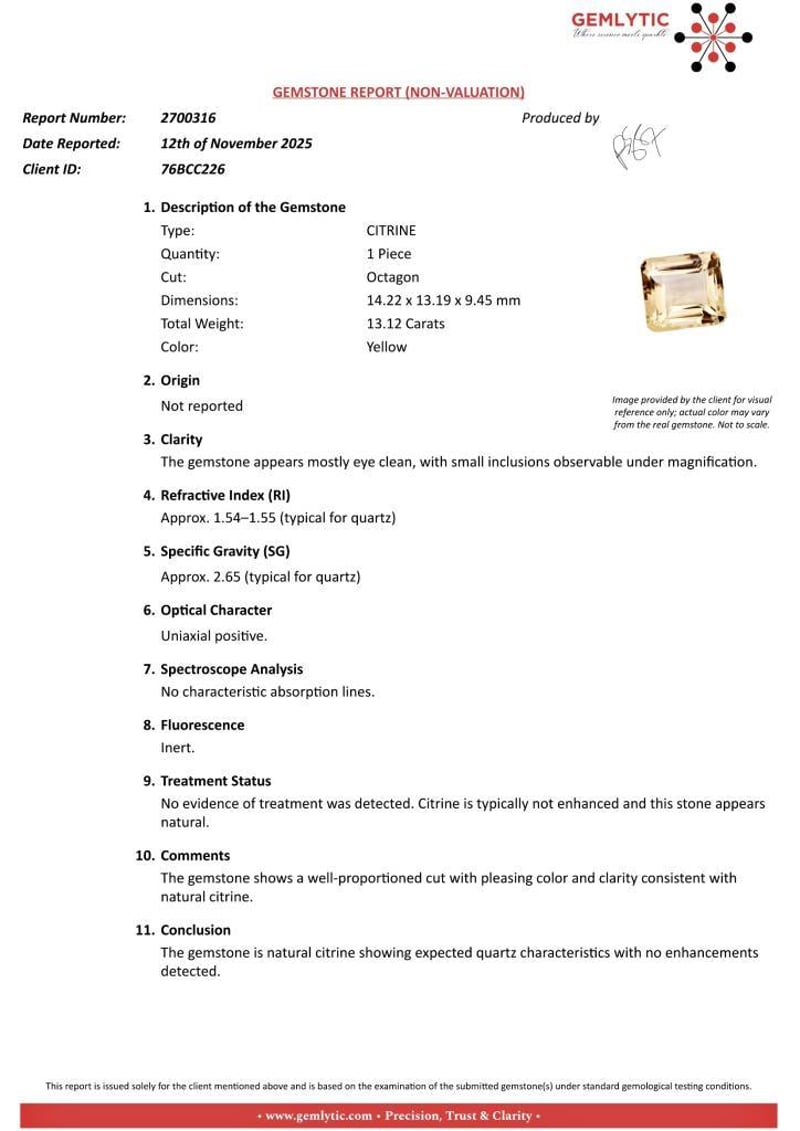 CITRINE - 13.12 CARATS - YELLOW Quantity: 1 PcsReport Number: 2700316Clarity: The Gemstone Appears Mostly Eye Clean, With Small Inclusions Observable Under Magnification.Measurements: 14.22 X 13.19 X 9.45Treatments: No Evidence Of Treatment Was Detected. Citrine Is Typically Not Enhanced And This Stone Appears Natural.Origin: Not ReportedRefractive Index: Approx. 1.54–1.55 (Typical For Quartz)Specific Gravity: Approx. 2.65 (Typical For Quartz)Spectroscope Analysis: No Characteristic Absorption Lines.Fluorescence: Inert.Comments: The Gemstone Shows A Well-Proportioned Cut With Pleasing Color And Clarity Consistent With Natural Citrine.Conclusion: The Gemstone Is Natural Citrine Showing Expected Quartz Characteristics With No Enhancements Detected. Condition: Good - Refer Images 0488985+19