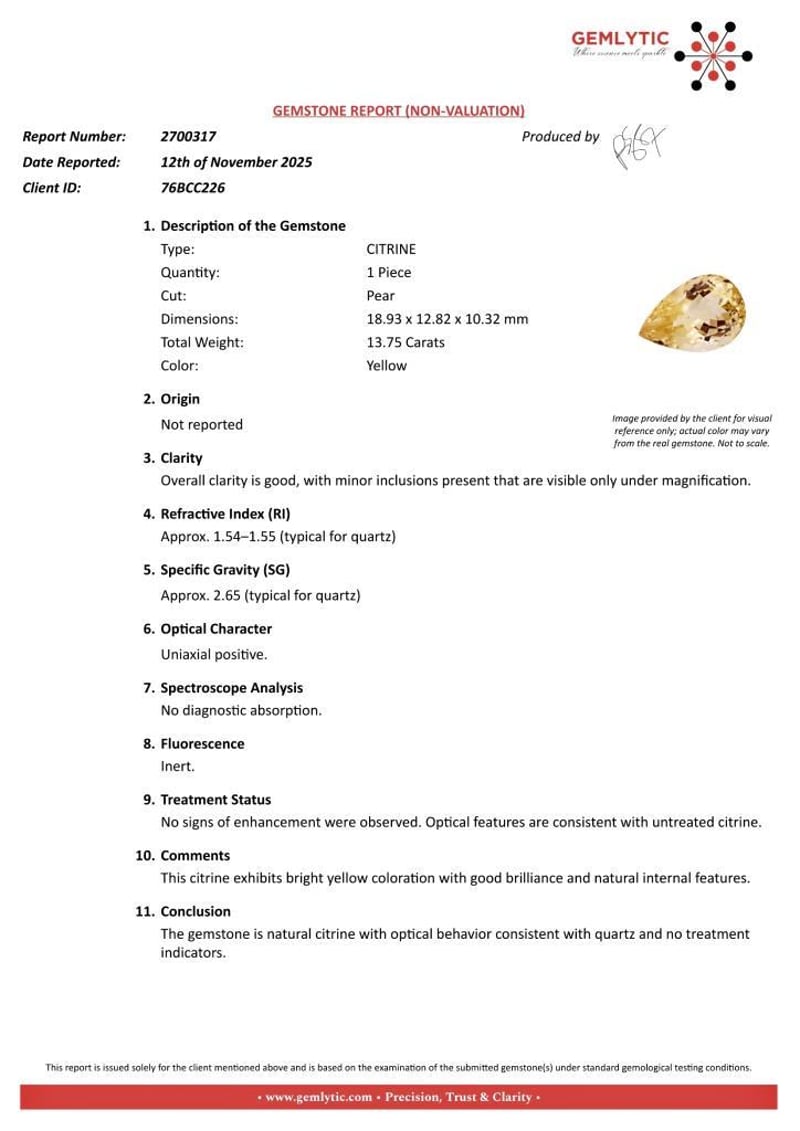CITRINE - 13.75 CARATS - YELLOW Quantity: 1 PcsReport Number: 2700317Clarity: Overall Clarity Is Good, With Minor Inclusions Present That Are Visible Only Under Magnification.Measurements: 18.93 X 12.82 X 10.32Treatments: No Signs Of Enhancement Were Observed. Optical Features Are Consistent With Untreated Citrine.Origin: Not ReportedRefractive Index: Approx. 1.54–1.55 (Typical For Quartz)Specific Gravity: Approx. 2.65 (Typical For Quartz)Spectroscope Analysis: No Diagnostic Absorption.Fluorescence: Inert.Comments: This Citrine Exhibits Bright Yellow Coloration With Good Brilliance And Natural Internal Features.Conclusion: The Gemstone Is Natural Citrine With Optical Behavior Consistent With Quartz And No Treatment Indicators. Condition: Good - Refer Images 0488985+20