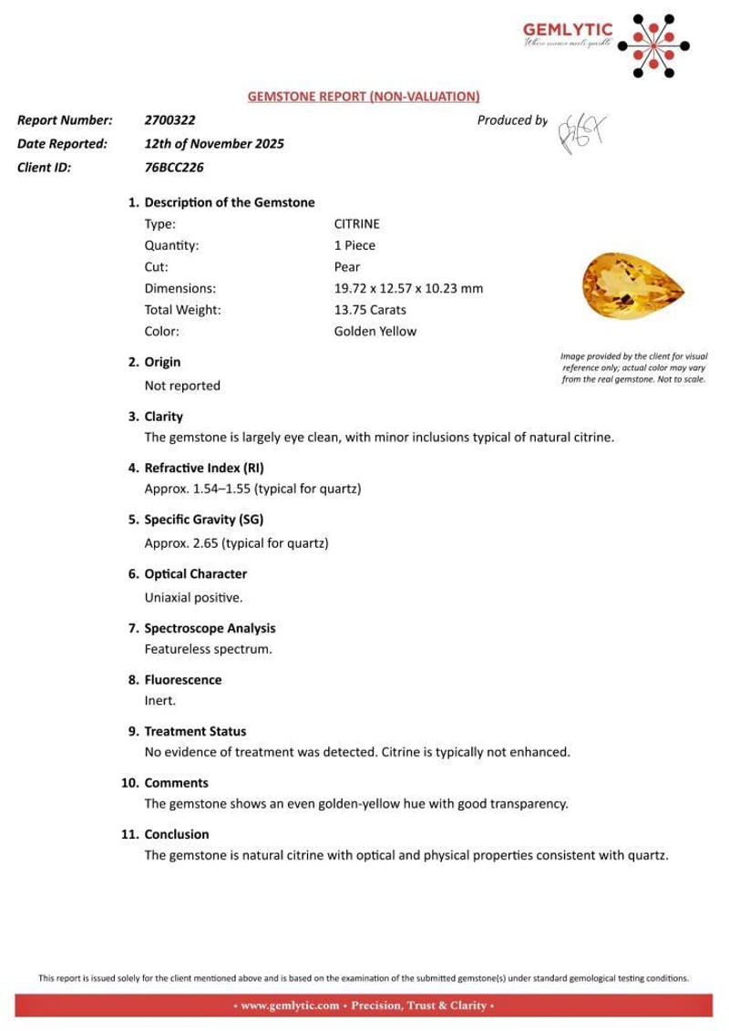CITRINE - 13.75 CARATS - GOLDEN YELLOW Quantity: 1 PcsReport Number: 2700322Clarity: The Gemstone Is Largely Eye Clean, With Minor Inclusions Typical Of Natural Citrine.Measurements: 19.72 X 12.57 X 10.23Treatments: No Evidence Of Treatment Was Detected. Citrine Is Typically Not Enhanced.Origin: Not ReportedRefractive Index: Approx. 1.54–1.55 (Typical For Quartz)Specific Gravity: Approx. 2.65 (Typical For Quartz)Spectroscope Analysis: Featureless Spectrum.Fluorescence: Inert.Comments: The Gemstone Shows An Even Golden-Yellow Hue With Good Transparency.Conclusion: The Gemstone Is Natural Citrine With Optical And Physical Properties Consistent With Quartz. Condition: Good - Refer Images 0488985+25