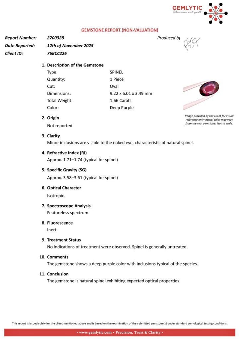 SPINEL - 1.66 CARATS - DEEP PURPLE Quantity: 1 PcsReport Number: 2700328Clarity: Minor Inclusions Are Visible To The Naked Eye, Characteristic Of Natural Spinel.Measurements: 9.22 X 6.01 X 3.49Treatments: No Indications Of Treatment Were Observed. Spinel Is Generally Untreated.Origin: Not ReportedRefractive Index: Approx. 1.71–1.74 (Typical For Spinel)Specific Gravity: Approx. 3.58–3.61 (Typical For Spinel)Spectroscope Analysis: Featureless Spectrum.Fluorescence: Inert.Comments: The Gemstone Shows A Deep Purple Color With Inclusions Typical Of The Species.Conclusion: The Gemstone Is Natural Spinel Exhibiting Expected Optical Properties. Condition: Good - Refer Images 0488985+31