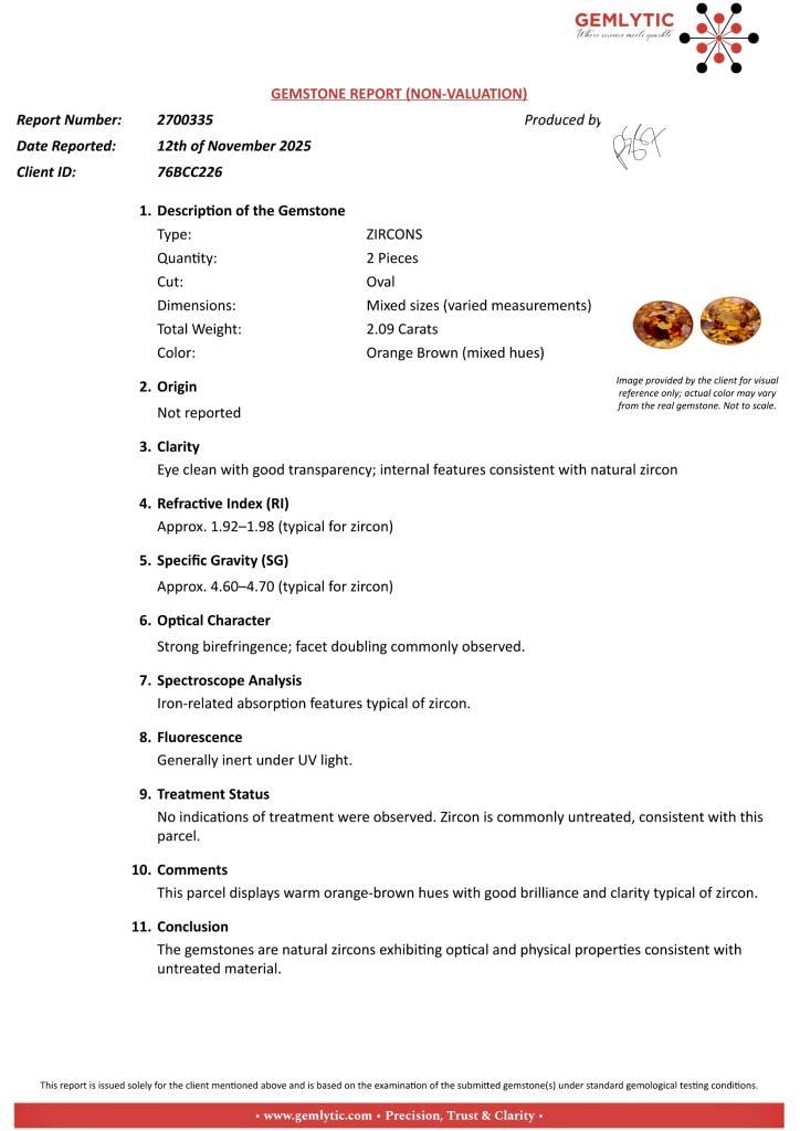 ZIRCONS - 2.09 CARATS - ORANGE BROWN (MIXED HUES) Quantity: 2 PcsReport Number: 2700335Clarity: Eye Clean With Good Transparency; Internal Features Consistent With Natural ZirconMeasurements: Mixed SizesTreatments: No Indications Of Treatment Were Observed. Zircon Is Commonly Untreated, Consistent With This Parcel.Origin: Not ReportedRefractive Index: Approx. 1.92–1.98 (Typical For Zircon)Specific Gravity: Approx. 4.60–4.70 (Typical For Zircon)Spectroscope Analysis: Iron-Related Absorption Features Typical Of Zircon.Fluorescence: Generally Inert Under Uv Light.Comments: This Parcel Displays Warm Orange-Brown Hues With Good Brilliance And Clarity Typical Of Zircon.Conclusion: The Gemstones Are Natural Zircons Exhibiting Optical And Physical Properties Consistent With Untreated Material. Condition: Good - Refer Images 0488985+38