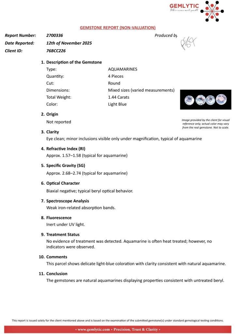 AQUAMARINES - 1.44 CARATS - LIGHT BLUE Quantity: 4 PcsReport Number: 2700336Clarity: Eye Clean; Minor Inclusions Visible Only Under Magnification, Typical Of AquamarineMeasurements: Mixed SizesTreatments: No Evidence Of Treatment Was Detected. Aquamarine Is Often Heat Treated; However, No Indicators Were Observed.Origin: Not ReportedRefractive Index: Approx. 1.57–1.58 (Typical For Aquamarine)Specific Gravity: Approx. 2.68–2.74 (Typical For Aquamarine)Spectroscope Analysis: Weak Iron-Related Absorption Bands.Fluorescence: Inert Under Uv Light.Comments: This Parcel Shows Delicate Light-Blue Coloration With Clarity Consistent With Natural Aquamarine.Conclusion: The Gemstones Are Natural Aquamarines Displaying Properties Consistent With Untreated Beryl. Condition: Good - Refer Images 0488985+39