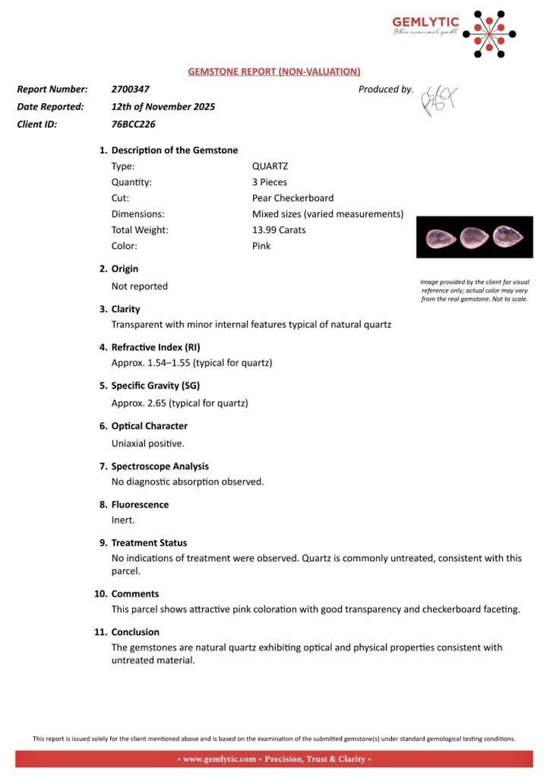 QUARTZ - 13.99 CARATS - PINK Quantity: 3 PcsReport Number: 2700347Clarity: Transparent With Minor Internal Features Typical Of Natural QuartzMeasurements: Mixed SizesTreatments: No Indications Of Treatment Were Observed. Quartz Is Commonly Untreated, Consistent With This Parcel.Origin: Not ReportedRefractive Index: Approx. 1.54–1.55 (Typical For Quartz)Specific Gravity: Approx. 2.65 (Typical For Quartz)Spectroscope Analysis: No Diagnostic Absorption Observed.Fluorescence: Inert.Comments: This Parcel Shows Attractive Pink Coloration With Good Transparency And Checkerboard Faceting.Conclusion: The Gemstones Are Natural Quartz Exhibiting Optical And Physical Properties Consistent With Untreated Material. Condition: Good - Refer Images 0488985+50
