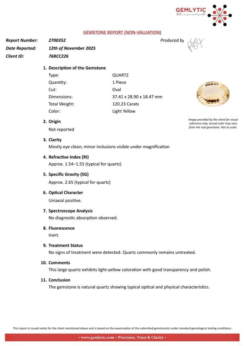 QUARTZ - 120.23 CARATS - LIGHT YELLOW Quantity: 1 PcsReport Number: 2700352Clarity: Mostly Eye Clean; Minor Inclusions Visible Under MagnificationMeasurements: 37.41 X 28.90 X 18.47Treatments: No Signs Of Treatment Were Detected. Quartz Commonly Remains Untreated.Origin: Not ReportedRefractive Index: Approx. 1.54–1.55 (Typical For Quartz)Specific Gravity: Approx. 2.65 (Typical For Quartz)Spectroscope Analysis: No Diagnostic Absorption Observed.Fluorescence: Inert.Comments: This Large Quartz Exhibits Light-Yellow Coloration With Good Transparency And Polish.Conclusion: The Gemstone Is Natural Quartz Showing Typical Optical And Physical Characteristics. Condition: Good - Refer Images 0488985+55