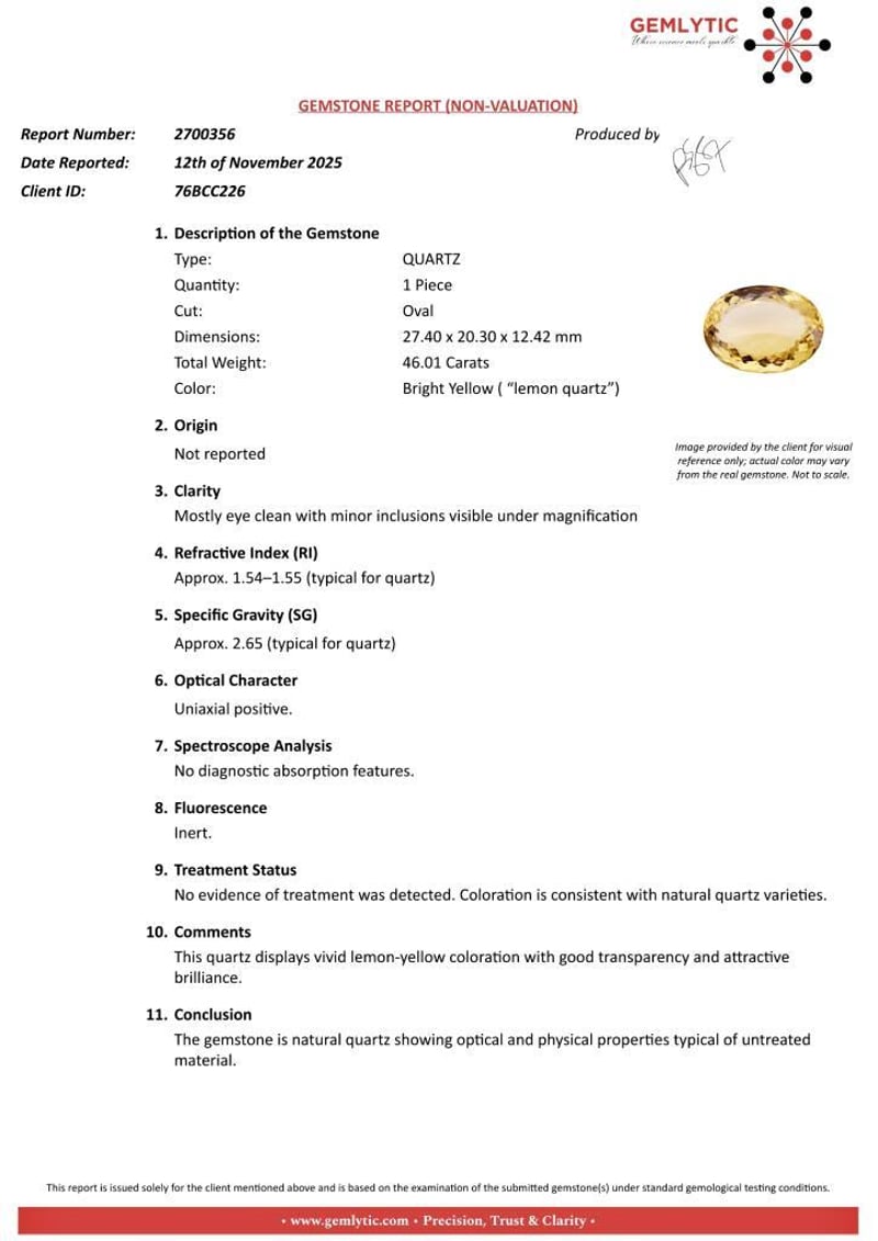 QUARTZ - 46.01 CARATS - BRIGHT YELLOW ( “LEMON QUARTZ”) Quantity: 1 PcsReport Number: 2700356Clarity: Mostly Eye Clean With Minor Inclusions Visible Under MagnificationMeasurements: 27.40 X 20.30 X 12.42Treatments: No Evidence Of Treatment Was Detected. Coloration Is Consistent With Natural Quartz Varieties.Origin: Not ReportedRefractive Index: Approx. 1.54–1.55 (Typical For Quartz)Specific Gravity: Approx. 2.65 (Typical For Quartz)Spectroscope Analysis: No Diagnostic Absorption Features.Fluorescence: Inert.Comments: This Quartz Displays Vivid Lemon-Yellow Coloration With Good Transparency And Attractive Brilliance.Conclusion: The Gemstone Is Natural Quartz Showing Optical And Physical Properties Typical Of Untreated Material. Condition: Good - Refer Images 0488985+59