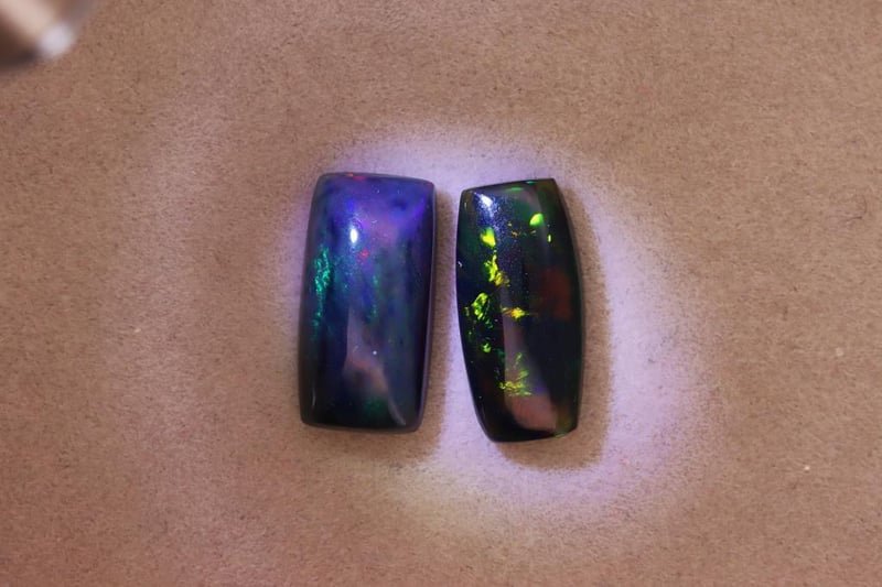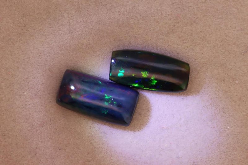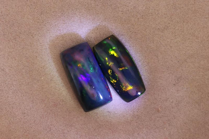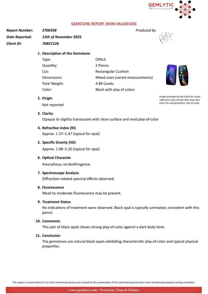 OPALS - 4.84 CARATS - BLACK WITH PLAY OF COLORS Quantity: 2 PcsReport Number: 2700358Clarity: Opaque To Slightly Translucent With Clean Surface And Vivid Play-Of-ColorMeasurements: Mixed SizesTreatments: No Indications Of Treatment Were Observed. Black Opal Is Typically Untreated, Consistent With This Parcel.Origin: Not ReportedRefractive Index: Approx. 1.37–1.47 (Typical For Opal)Specific Gravity: Approx. 1.98–2.20 (Typical For Opal)Spectroscope Analysis: Diffraction-Related Spectral Effects Observed.Fluorescence: Weak To Moderate Fluorescence May Be Present.Comments: This Pair Of Black Opals Shows Strong Play-Of-Color Against A Dark Body Tone.Conclusion: The Gemstones Are Natural Black Opals Exhibiting Characteristic Play-Of-Color And Typical Physical Properties. Condition: Good - Refer Images 0488985+61
