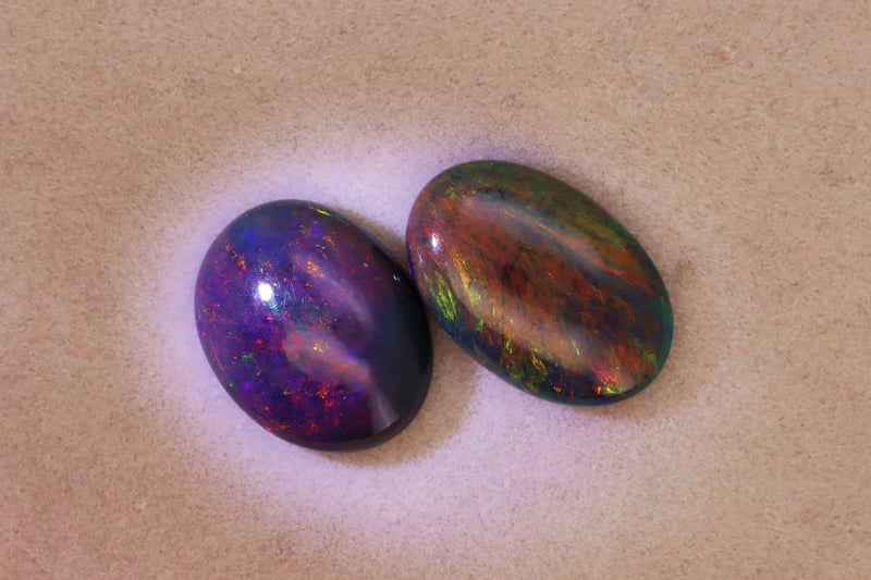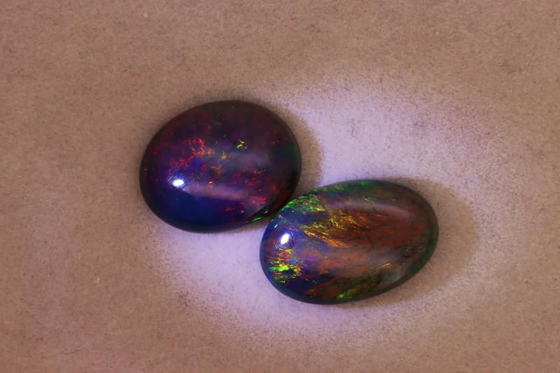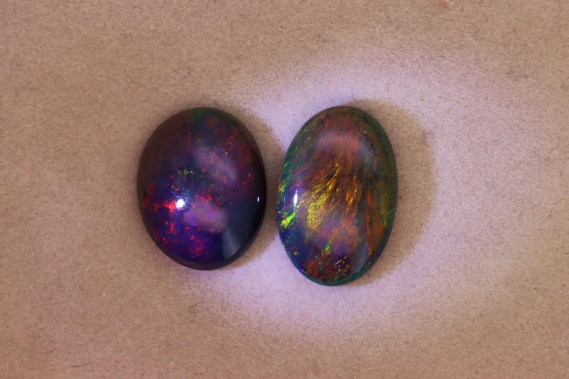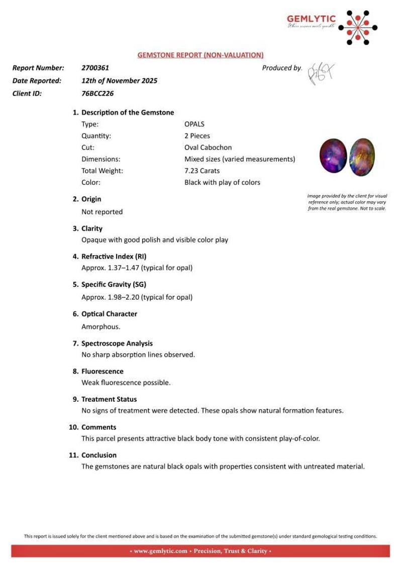 OPALS - 7.23 CARATS - BLACK WITH PLAY OF COLORS Quantity: 2 PcsReport Number: 2700361Clarity: Opaque With Good Polish And Visible Color PlayMeasurements: Mixed SizesTreatments: No Signs Of Treatment Were Detected. These Opals Show Natural Formation Features.Origin: Not ReportedRefractive Index: Approx. 1.37–1.47 (Typical For Opal)Specific Gravity: Approx. 1.98–2.20 (Typical For Opal)Spectroscope Analysis: No Sharp Absorption Lines Observed.Fluorescence: Weak Fluorescence Possible.Comments: This Parcel Presents Attractive Black Body Tone With Consistent Play-Of-Color.Conclusion: The Gemstones Are Natural Black Opals With Properties Consistent With Untreated Material. Condition: Good - Refer Images 0488985+64