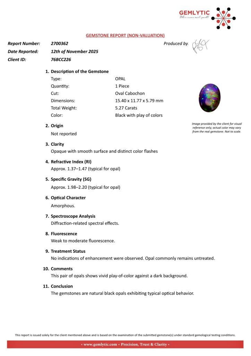 OPAL - 5.27 CARATS - BLACK WITH PLAY OF COLORS Quantity: 1 PcsReport Number: 2700362Clarity: Opaque With Smooth Surface And Distinct Color FlashesMeasurements: 15.40 X 11.77 X 5.79Treatments: No Indications Of Enhancement Were Observed. Opal Commonly Remains Untreated.Origin: Not ReportedRefractive Index: Approx. 1.37–1.47 (Typical For Opal)Specific Gravity: Approx. 1.98–2.20 (Typical For Opal)Spectroscope Analysis: Diffraction-Related Spectral Effects.Fluorescence: Weak To Moderate Fluorescence.Comments: This Pair Of Opals Shows Vivid Play-Of-Color Against A Dark Background.Conclusion: The Gemstones Are Natural Black Opals Exhibiting Typical Optical Behavior. Condition: Good - Refer Images 0488985+65