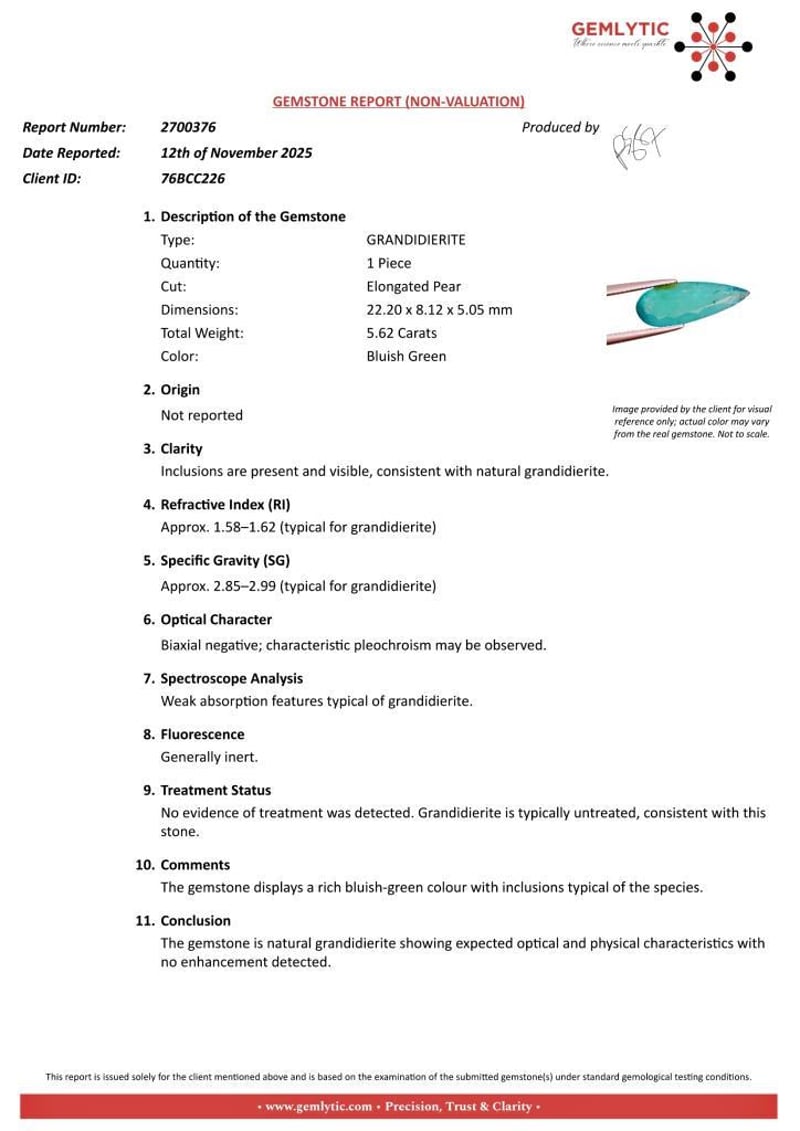 GRANDIDIERITE - 5.62 CARATS - BLUISH GREEN Quantity: 1 PcsReport Number: 2700376Clarity: Inclusions Are Present And Visible, Consistent With Natural Grandidierite.Measurements: 22.20 X 8.12 X 5.05Treatments: No Evidence Of Treatment Was Detected. Grandidierite Is Typically Untreated, Consistent With This Stone.Origin: Not ReportedRefractive Index: Approx. 1.58–1.62 (Typical For Grandidierite)Specific Gravity: Approx. 2.85–2.99 (Typical For Grandidierite)Spectroscope Analysis: Weak Absorption Features Typical Of Grandidierite.Fluorescence: Generally Inert.Comments: The Gemstone Displays A Rich Bluish-Green Colour With Inclusions Typical Of The Species.Conclusion: The Gemstone Is Natural Grandidierite Showing Expected Optical And Physical Characteristics With No Enhancement Detected. Condition: Good - Refer Images 0488985+79